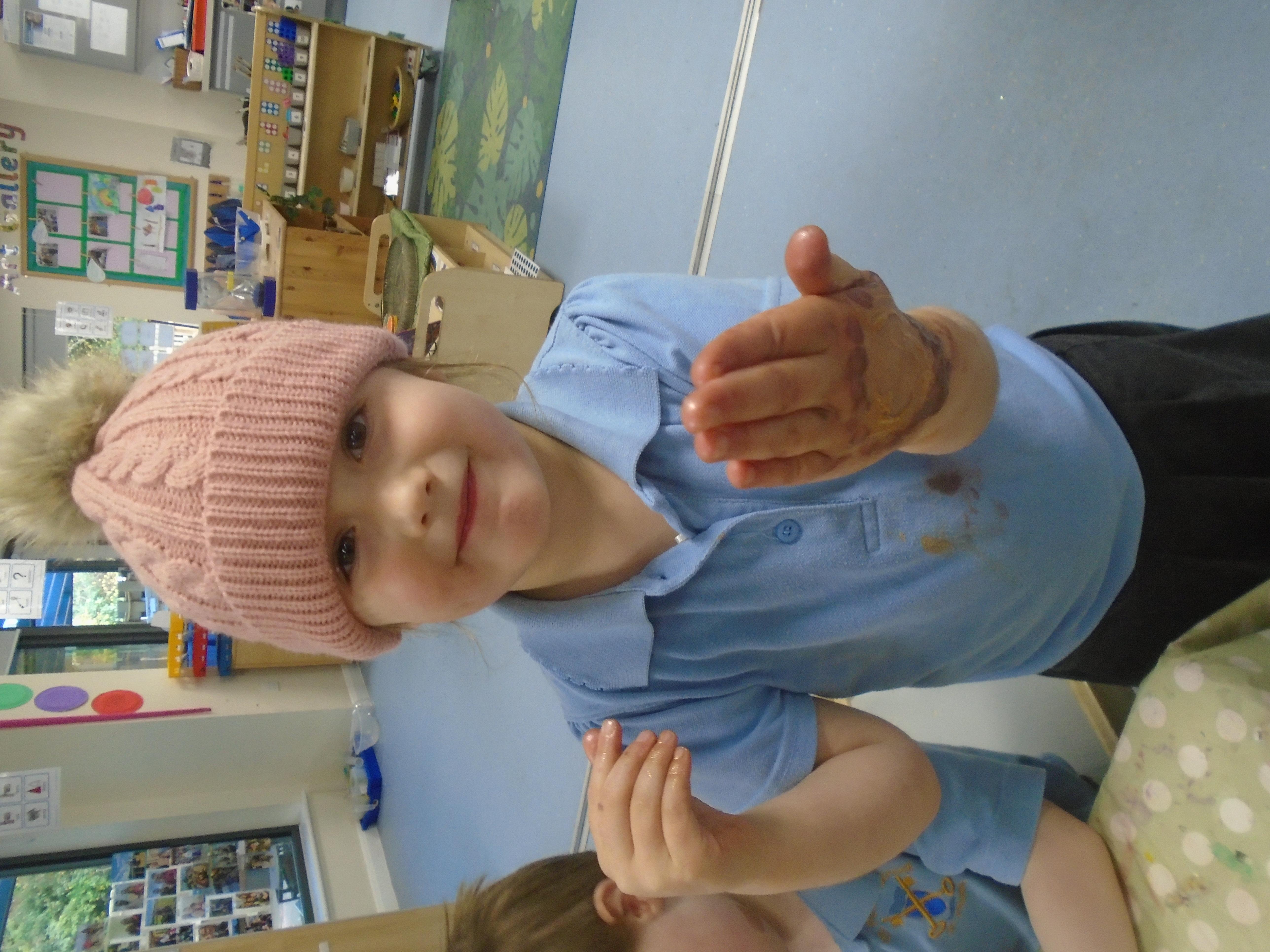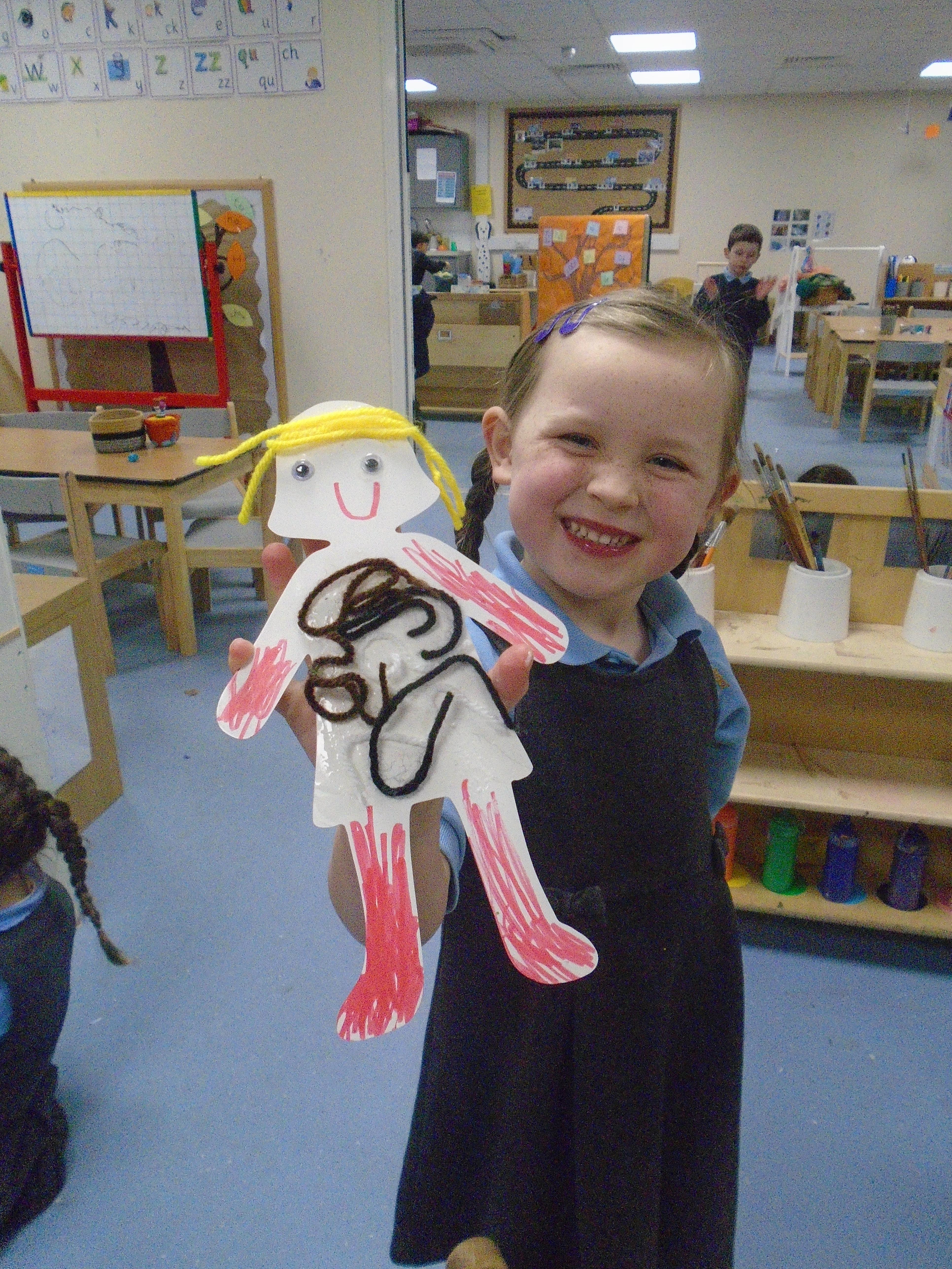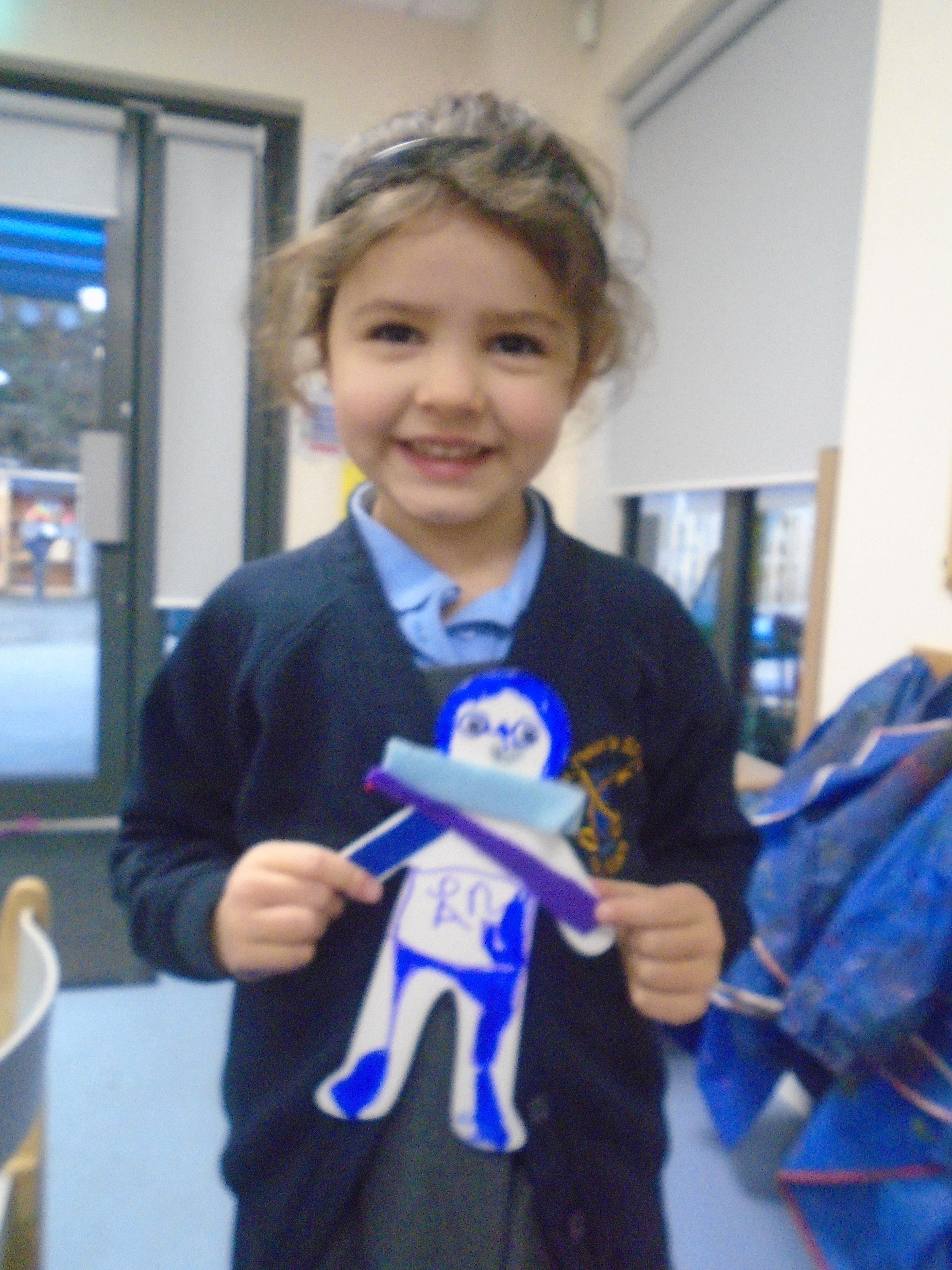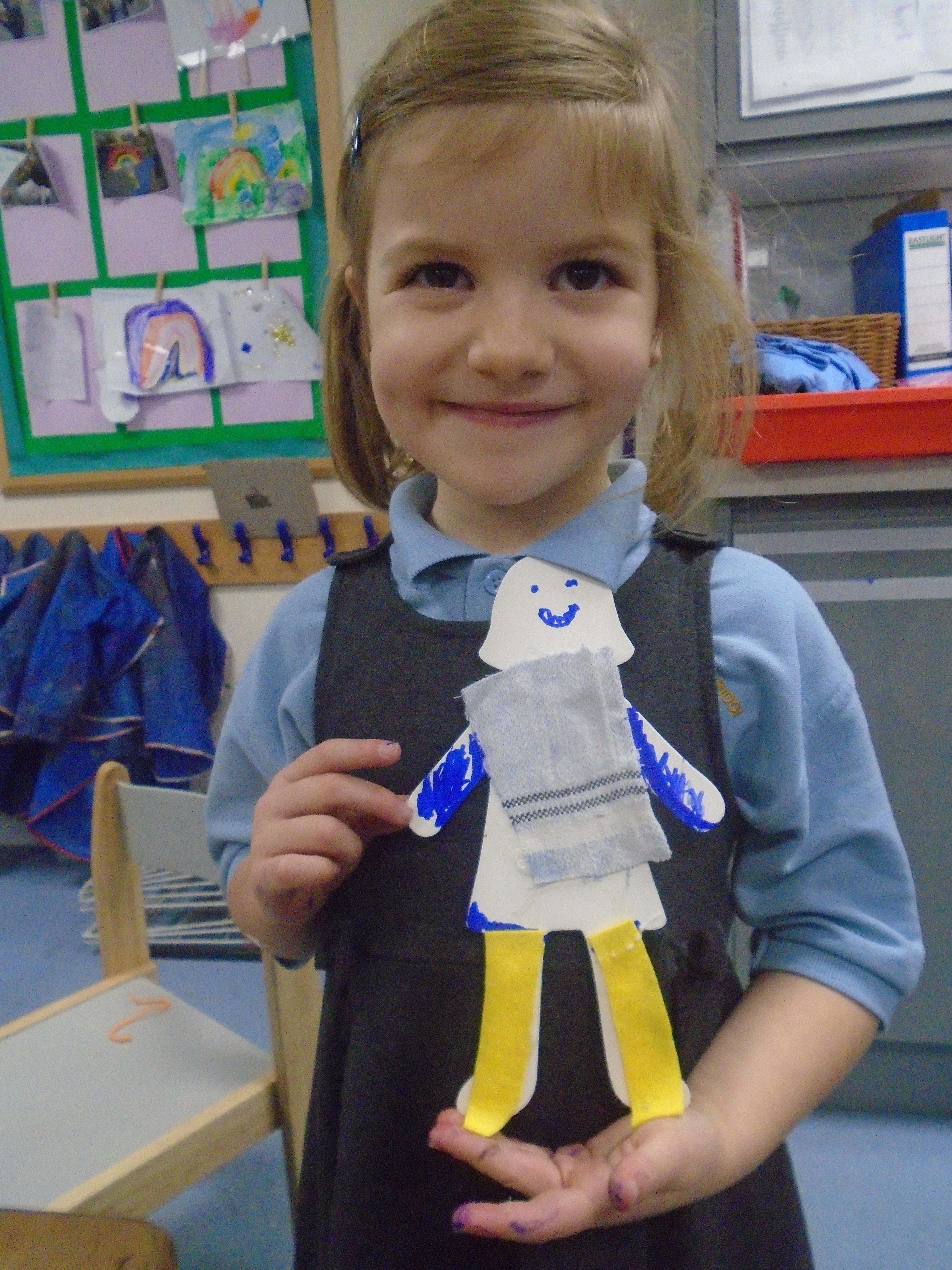 Winter: This week we read 'Betty and the Yeti' by Ella Burfoot and discussed the different signs of Winter and the clothes that you might wear. During Play and Learn some of the children then decided to make their own puppets and used pieces of material to collage the clothes.