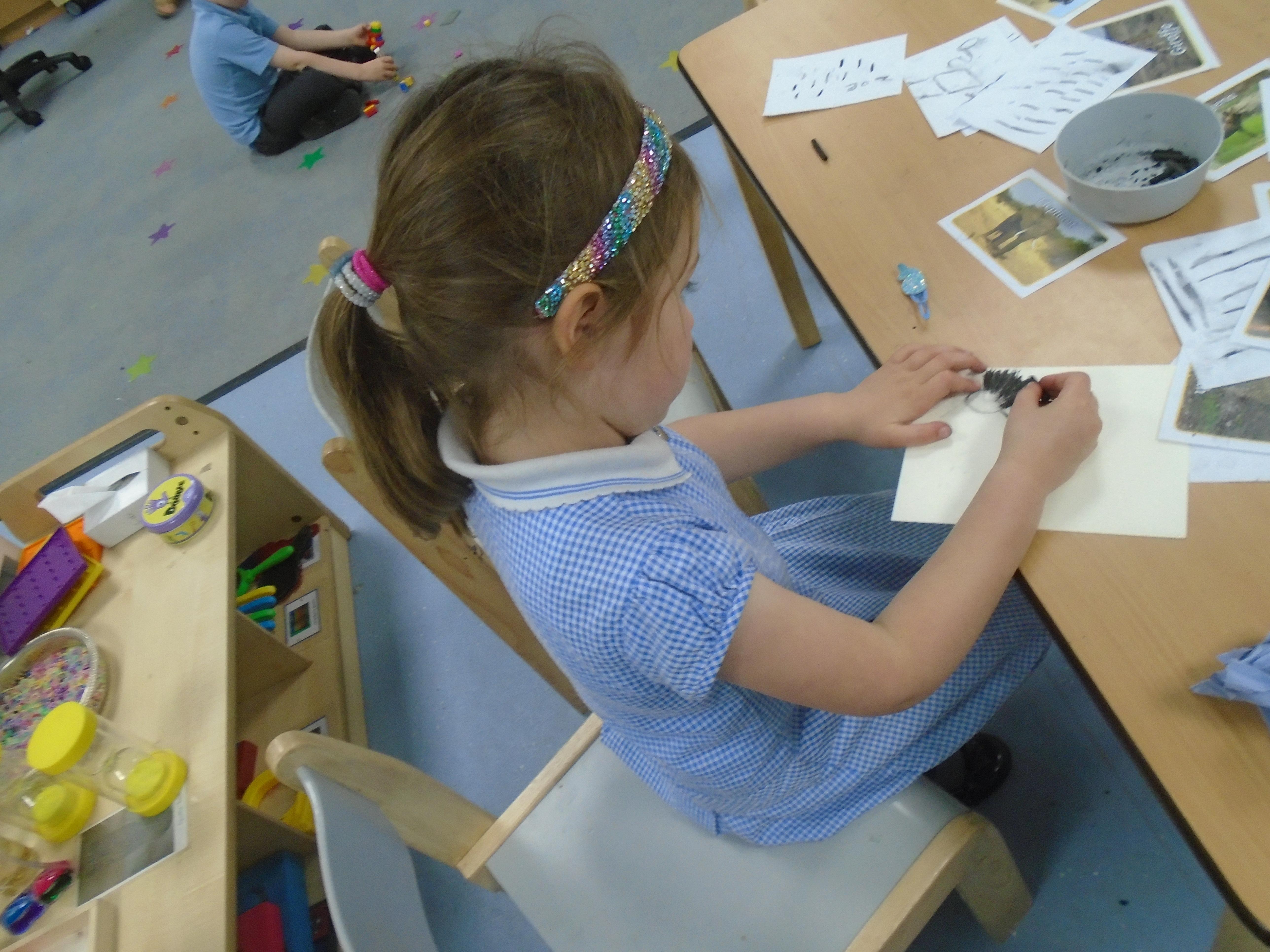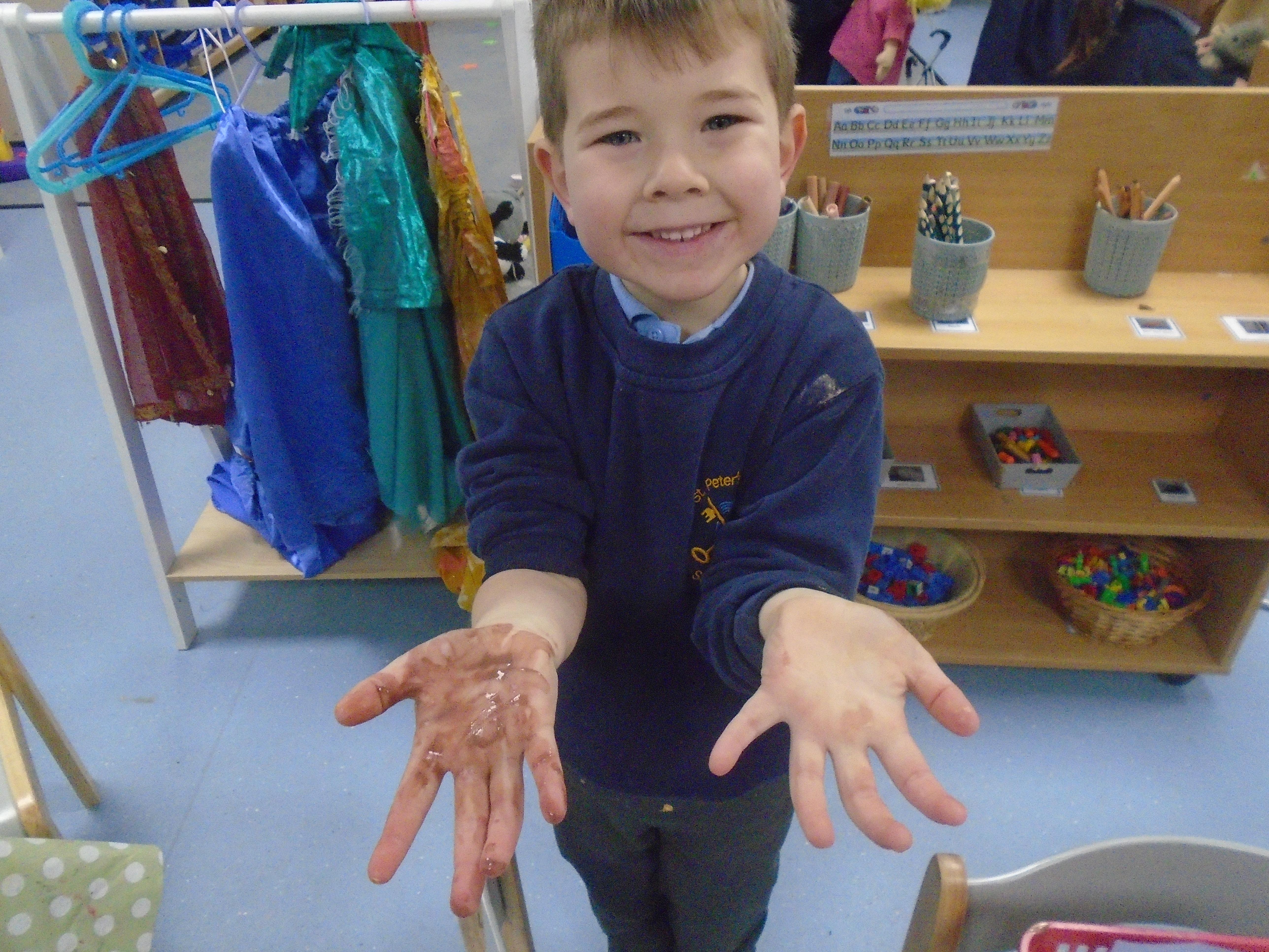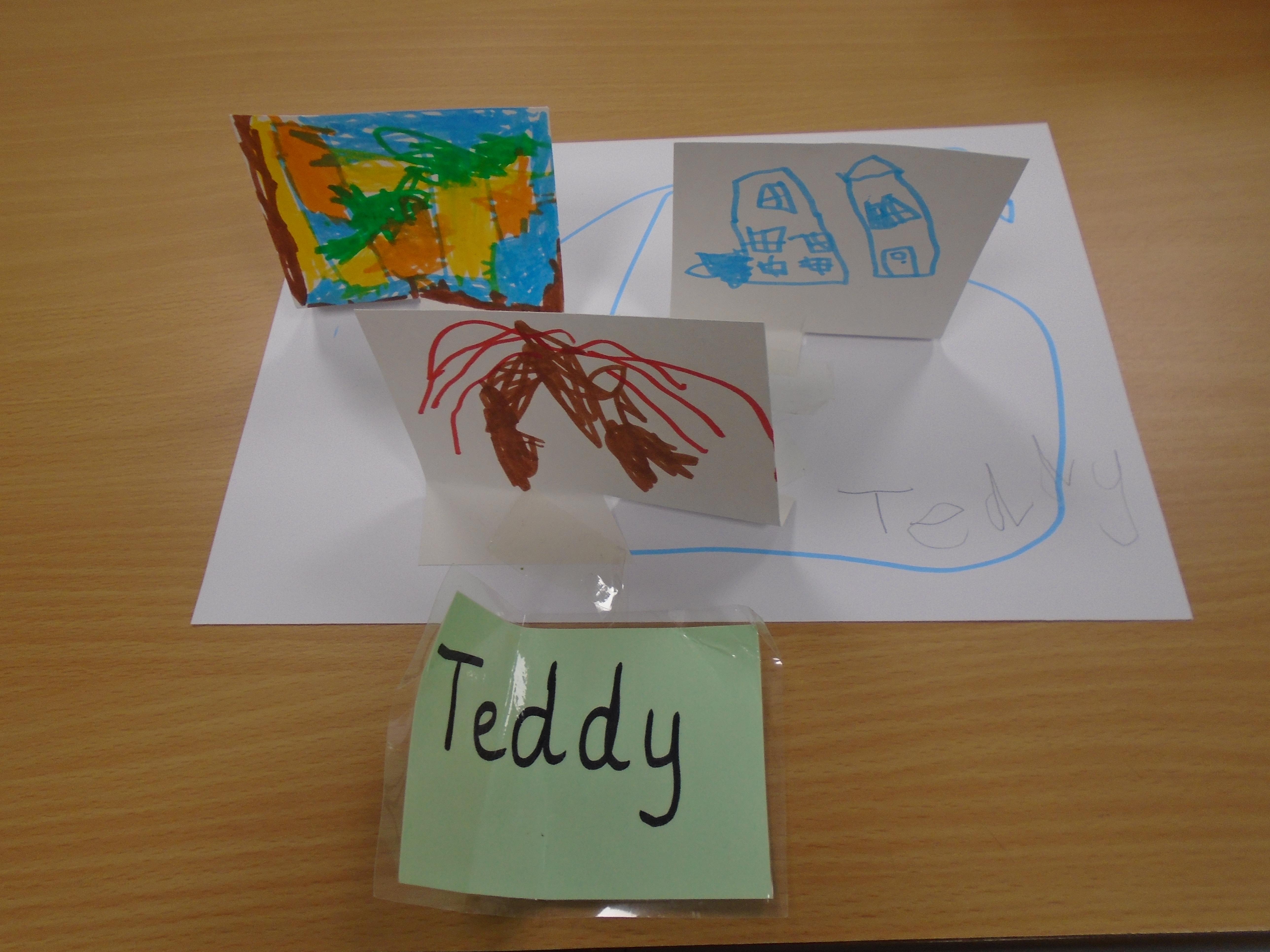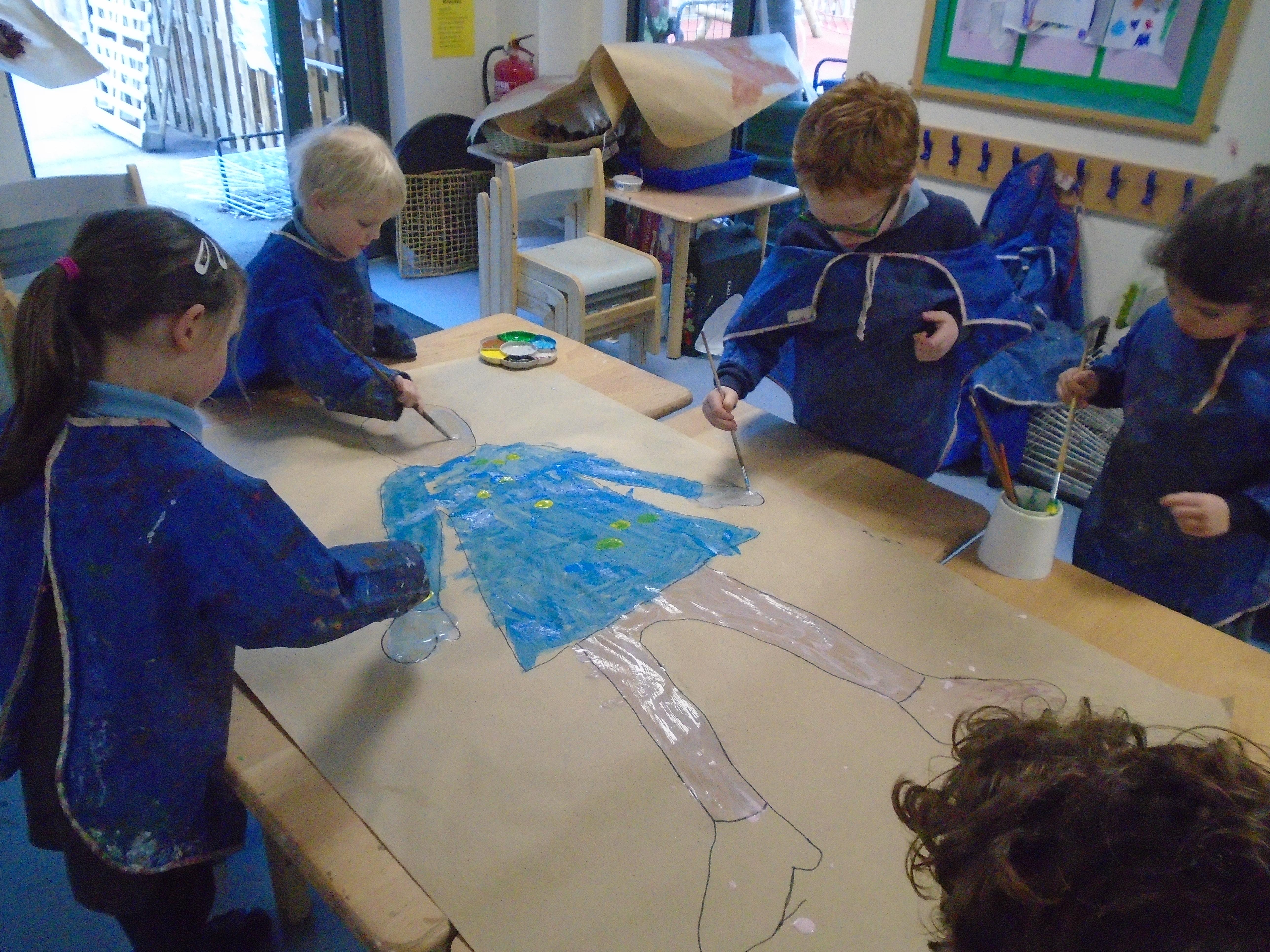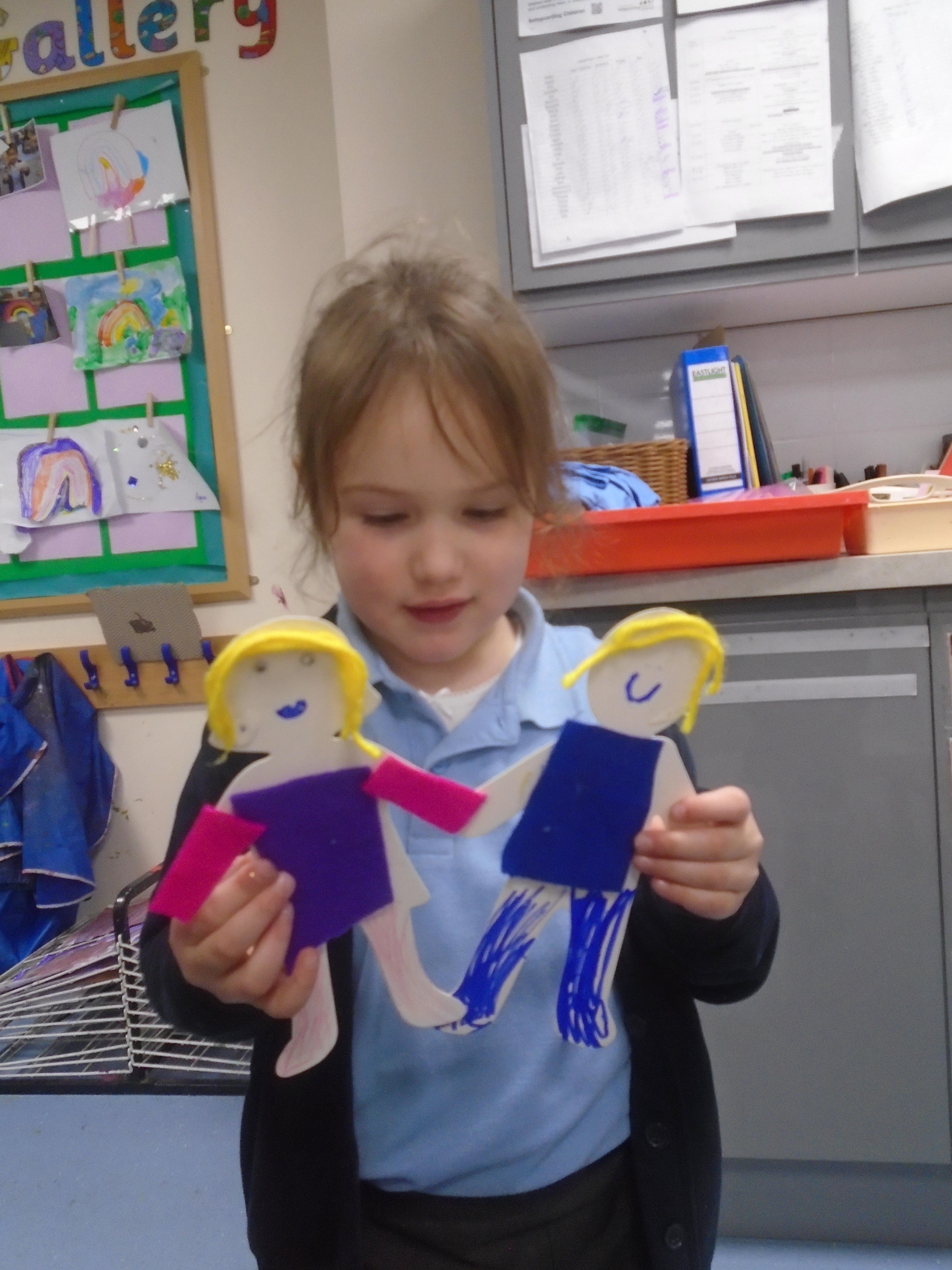 Winter: This week we read 'Betty and the Yeti' by Ella Burfoot and discussed the different signs of Winter and the clothes that you might wear. During Play and Learn some of the children then decided to make their own puppets and used pieces of material to collage the clothes.