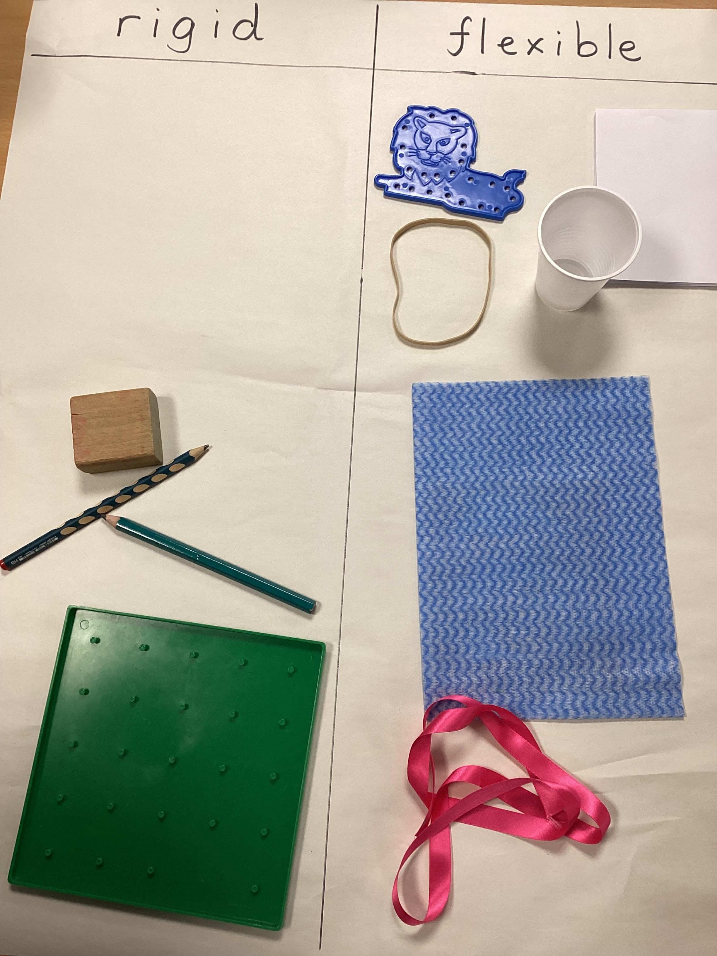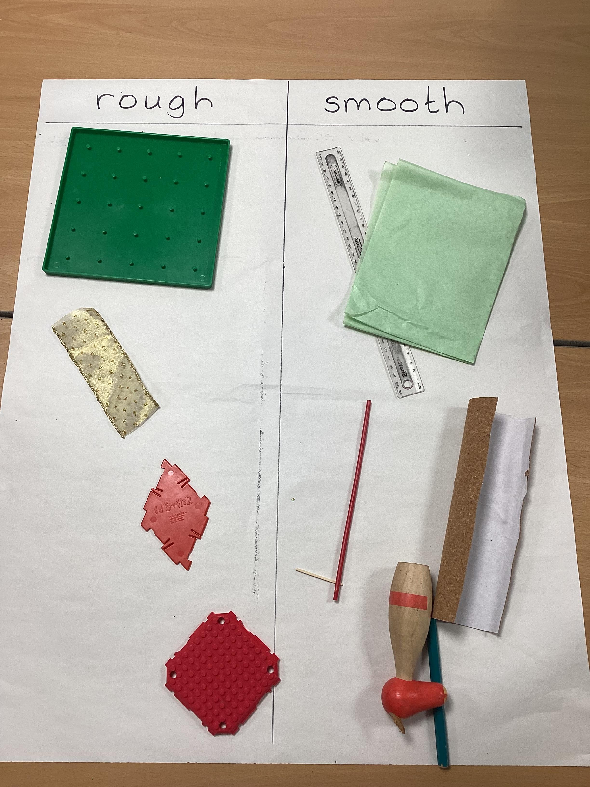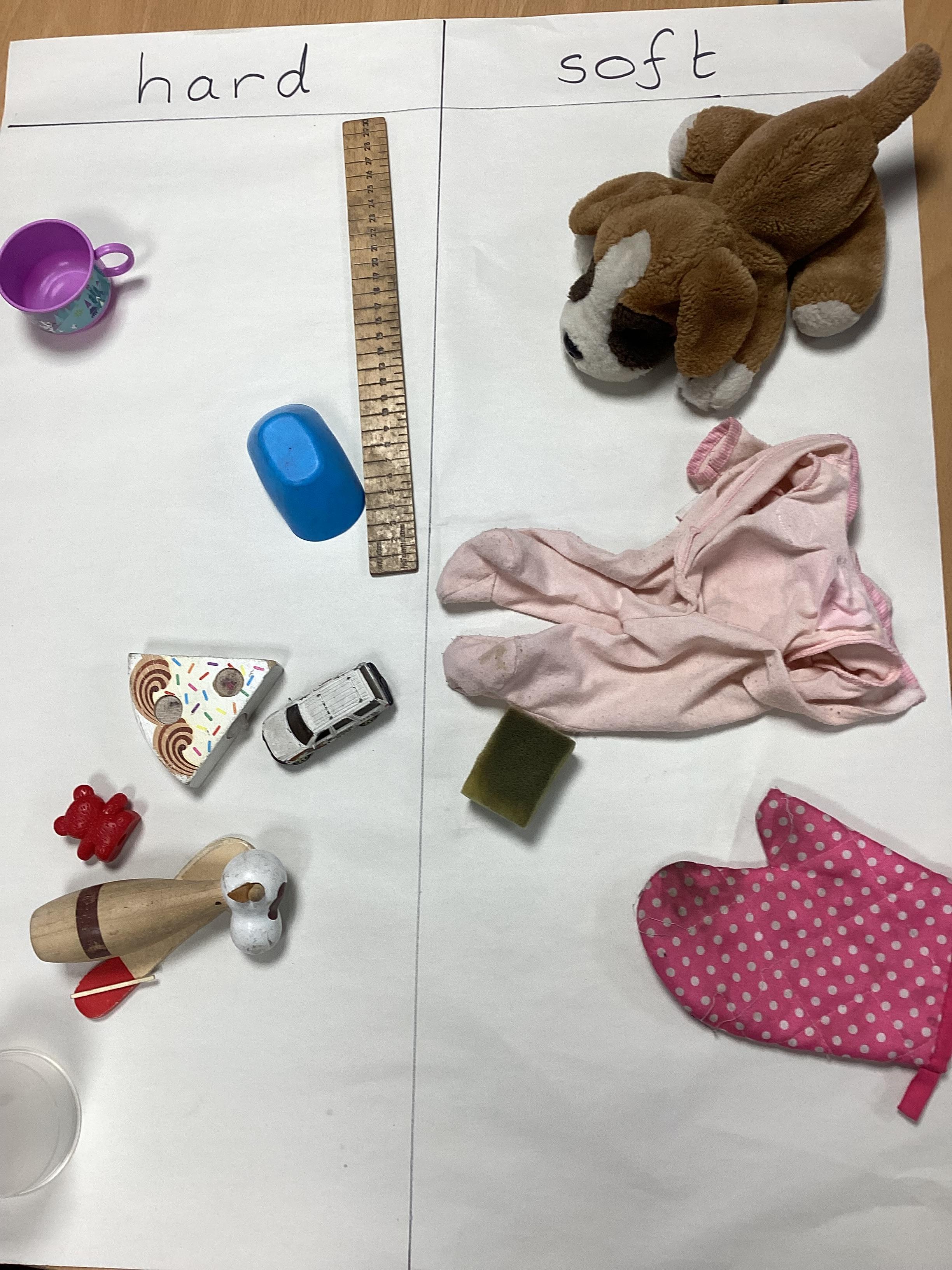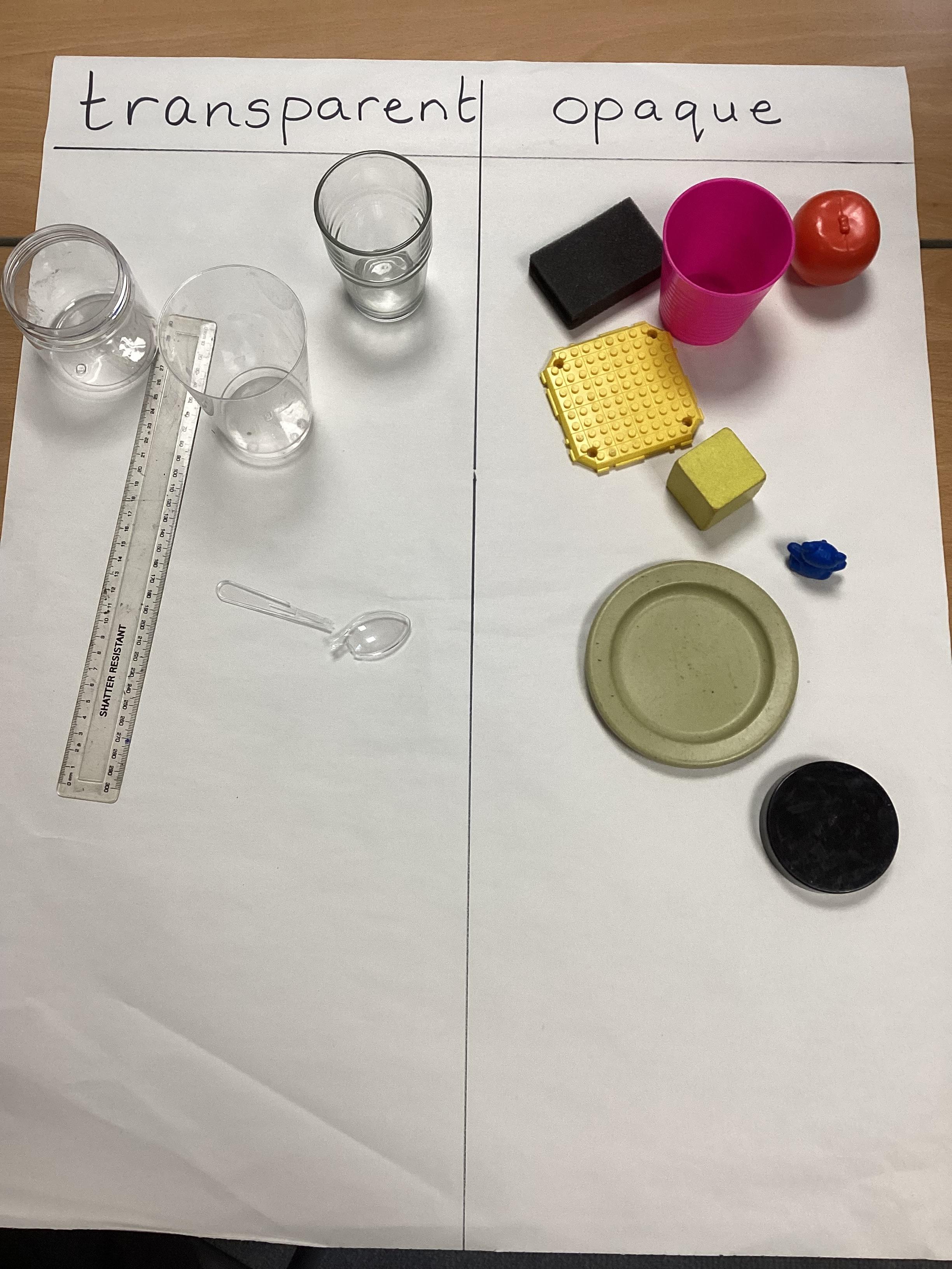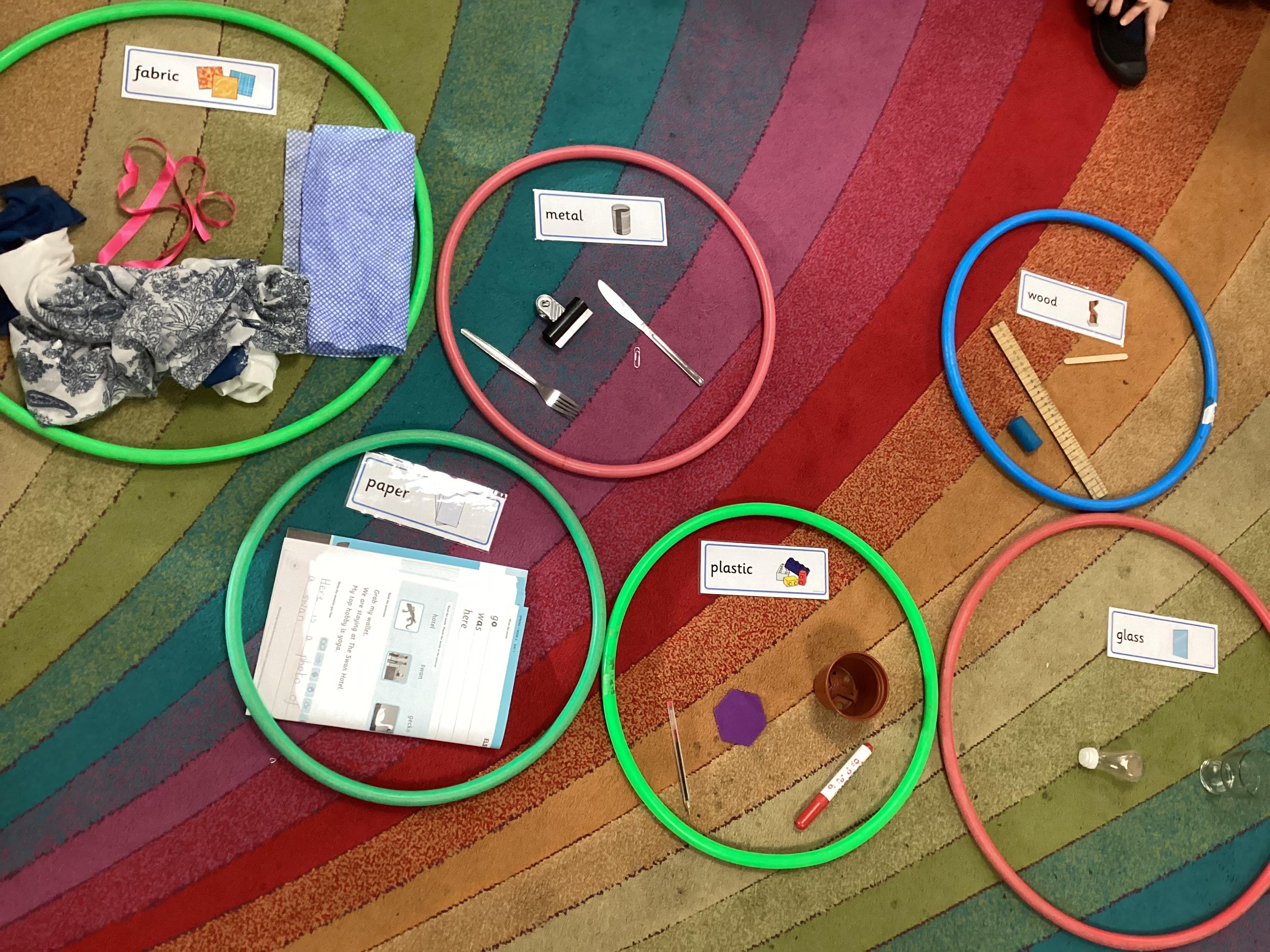 Our new science topic is 'materials'. We began by learning a little about six materials - glass, wood, plastic, metal, fabric and paper. Then we sorted some everyday objects according to what they were made from.