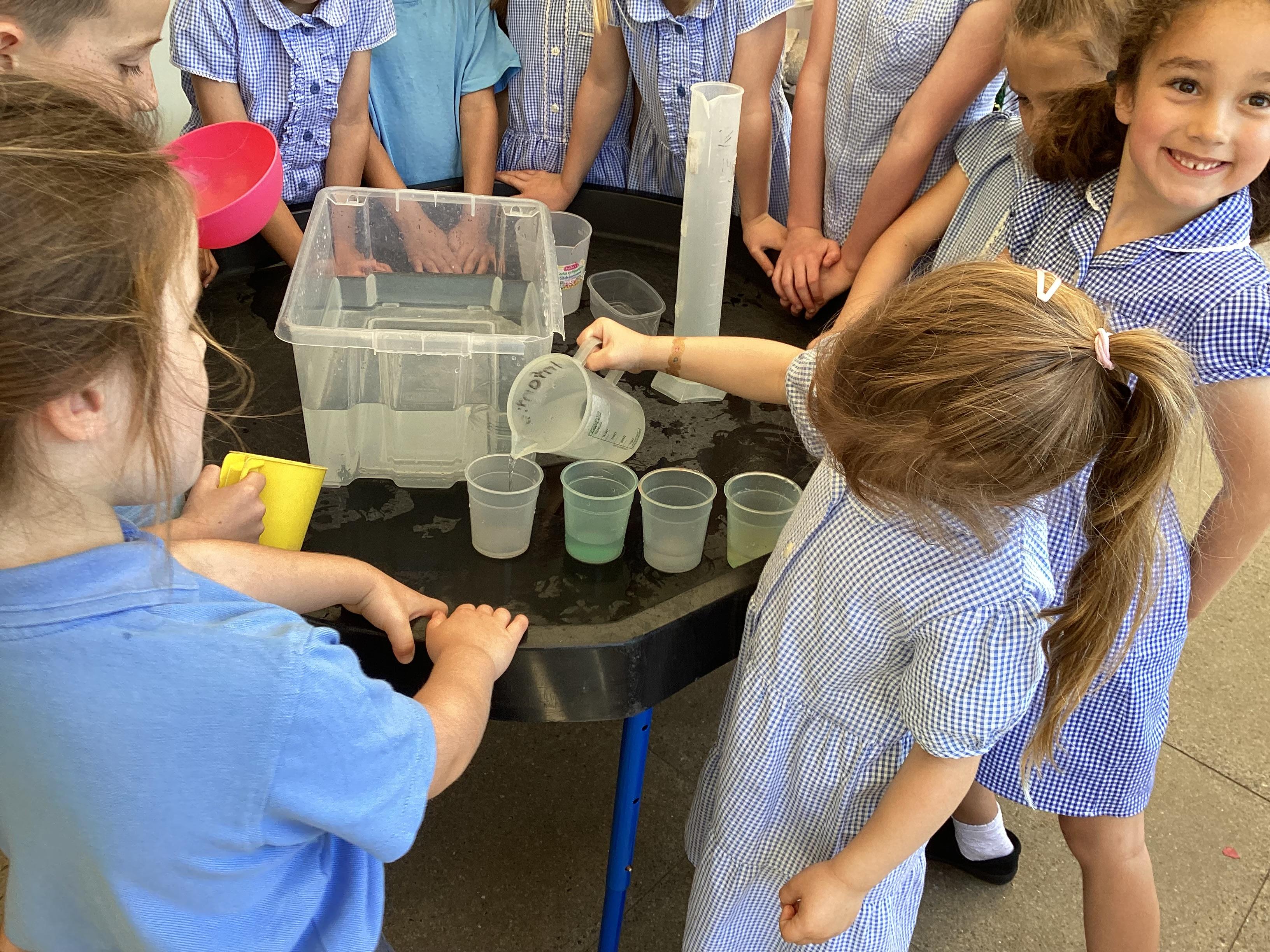 In Maths we have been learning about halves and quarters in the context of capacity. It was a very nice activity to do on a hot day!