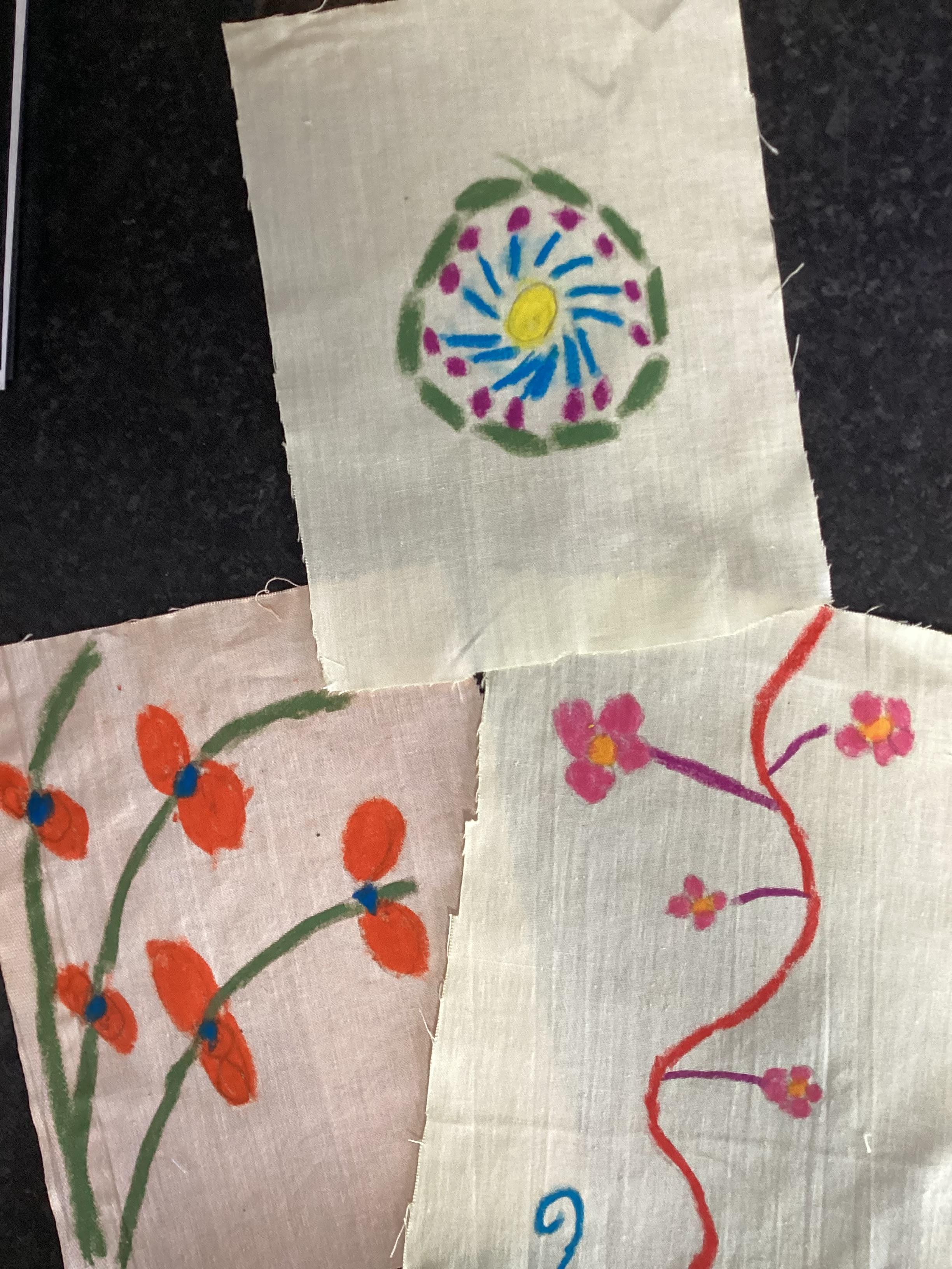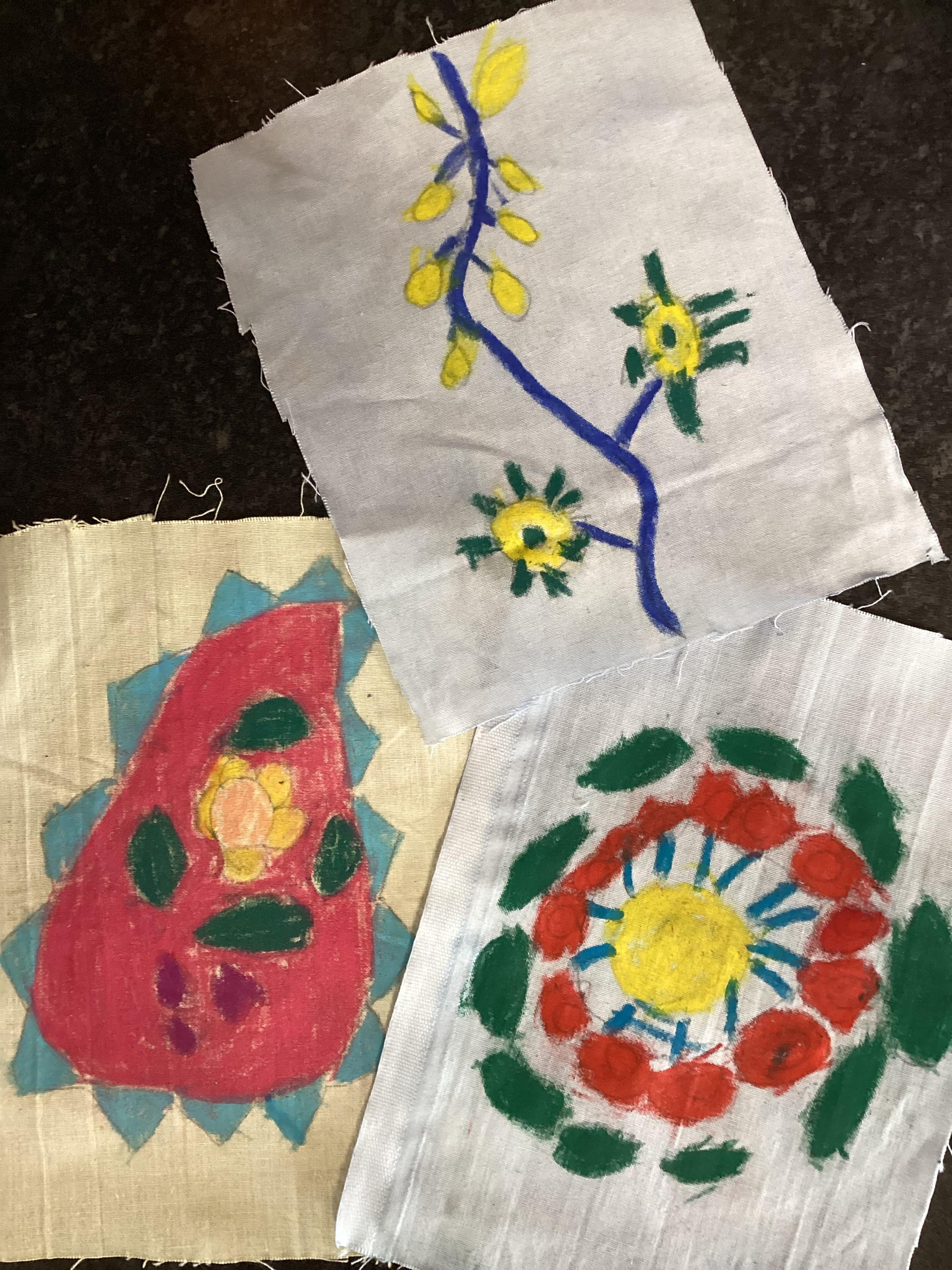 In Art we have been looking at sari patterns. We began by sketching some of the motifs we found on sari fabric. Then we chose one and drew it onto fabric before using oil crayons to colour it. Today we have added a background wash. We will finish them off next week by adding decoration with sequins and buttons.