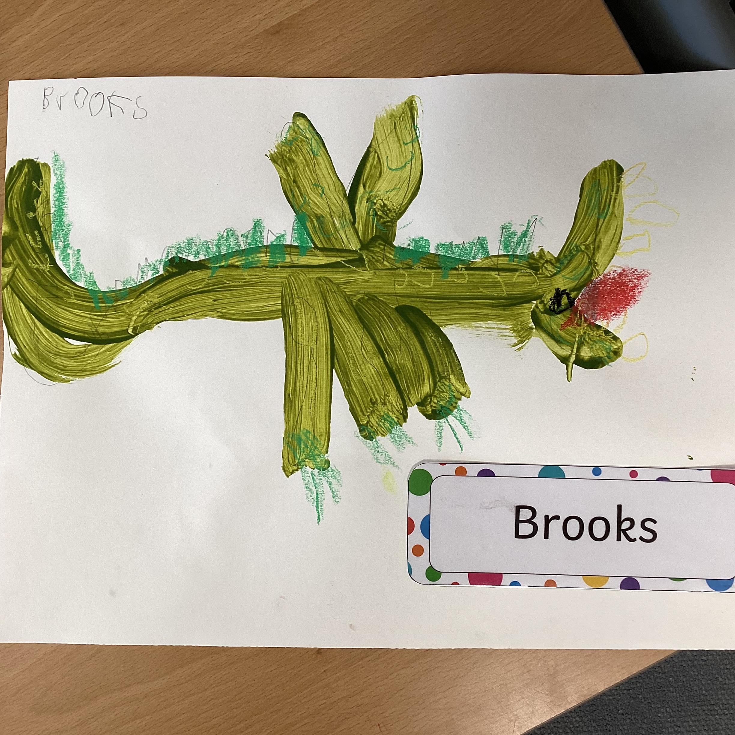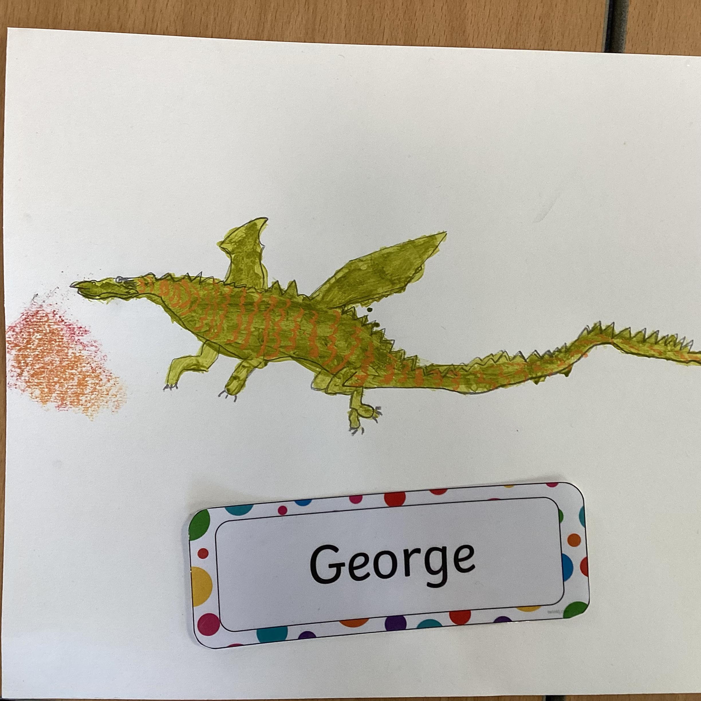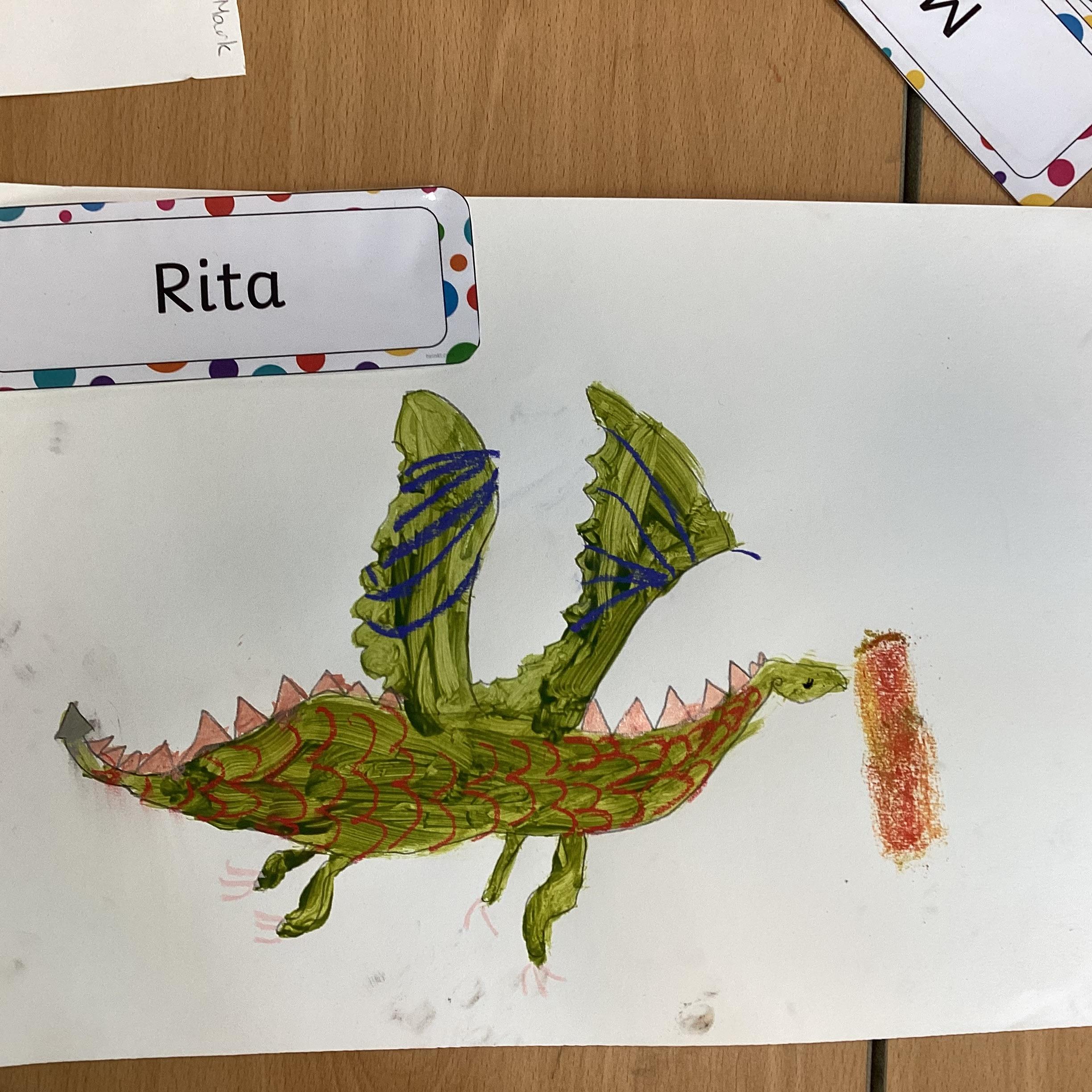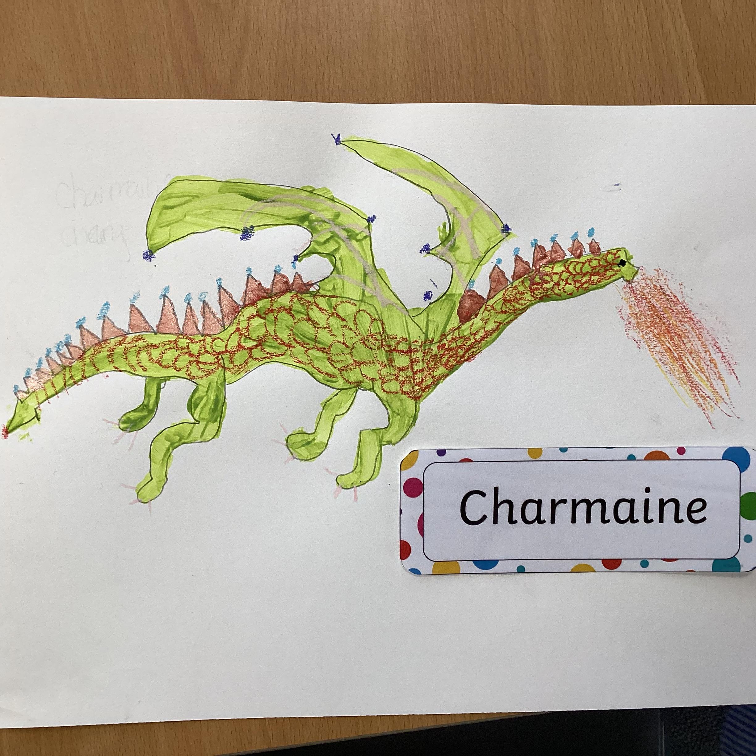 In art we have been drawing and painting dragons. We mixed our own green to paint our drawing and then added detail with gold paint and pastels. We are proud of them!