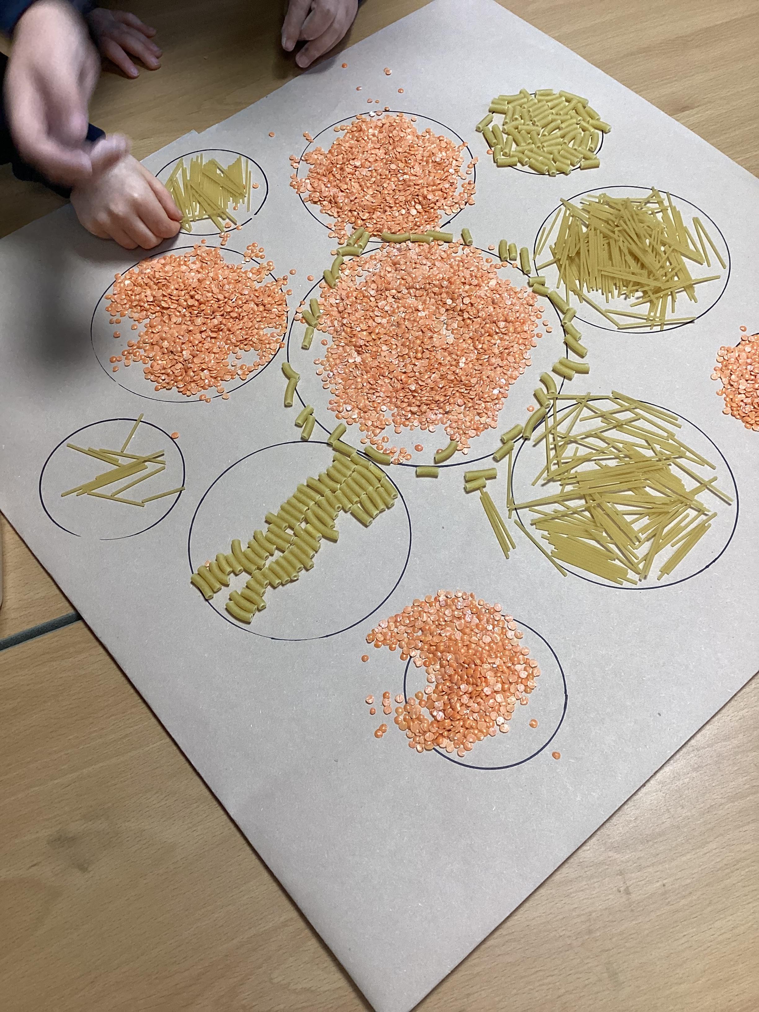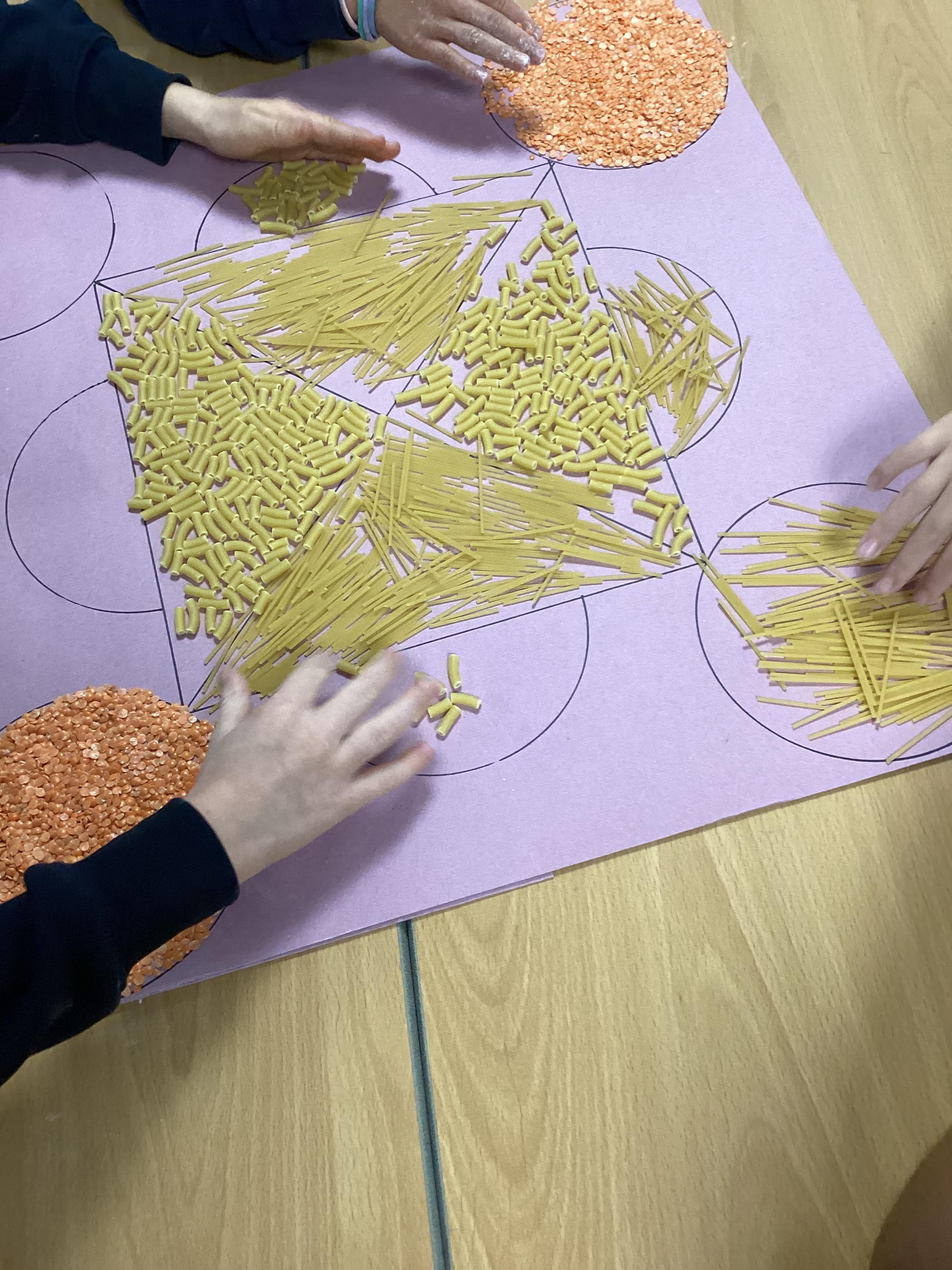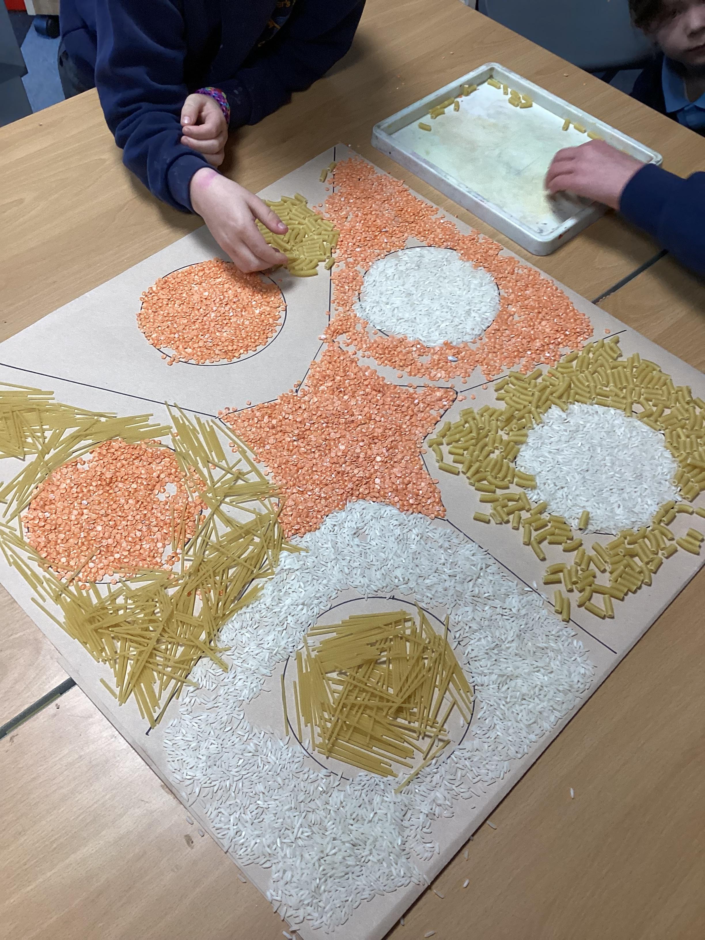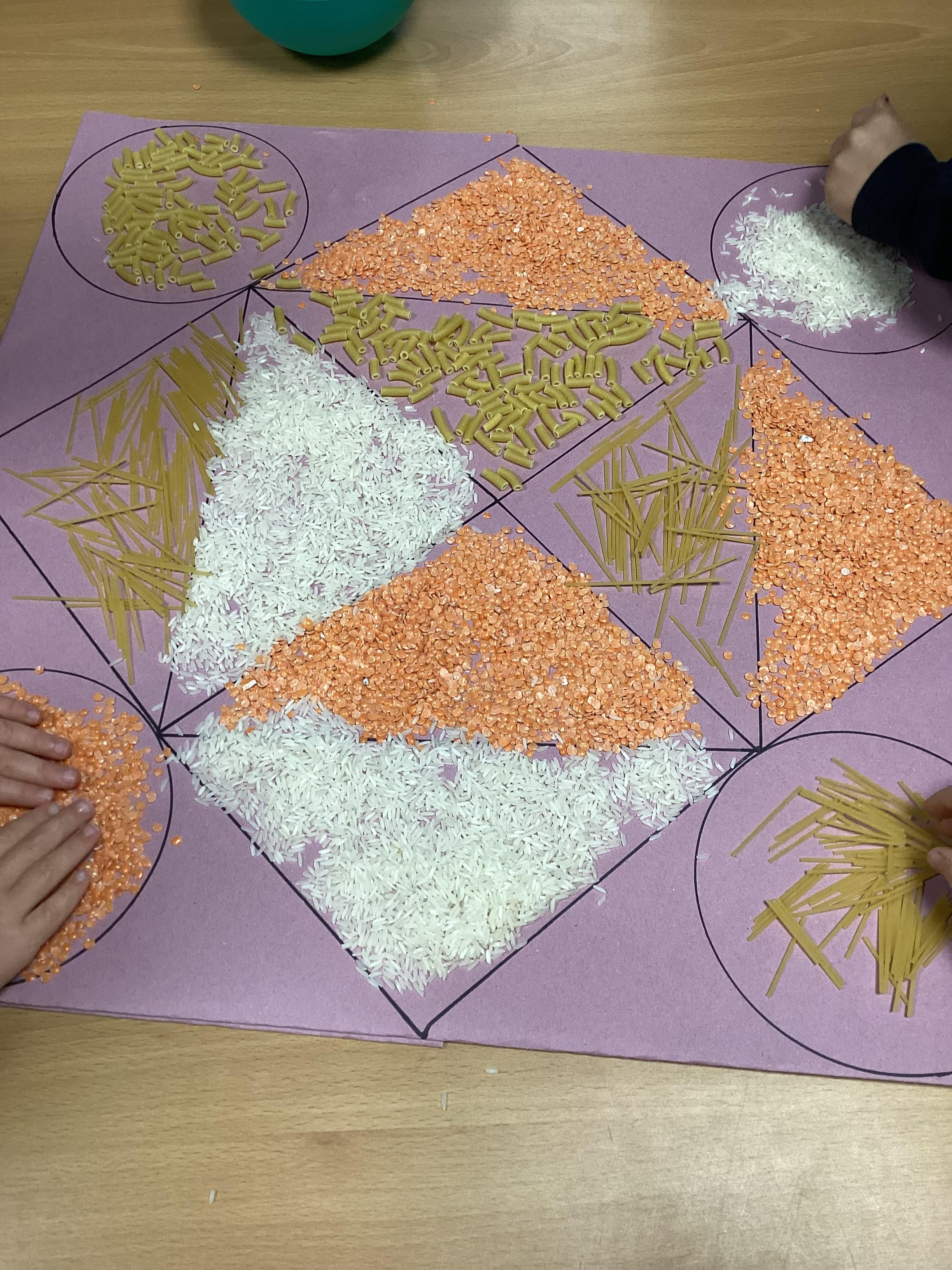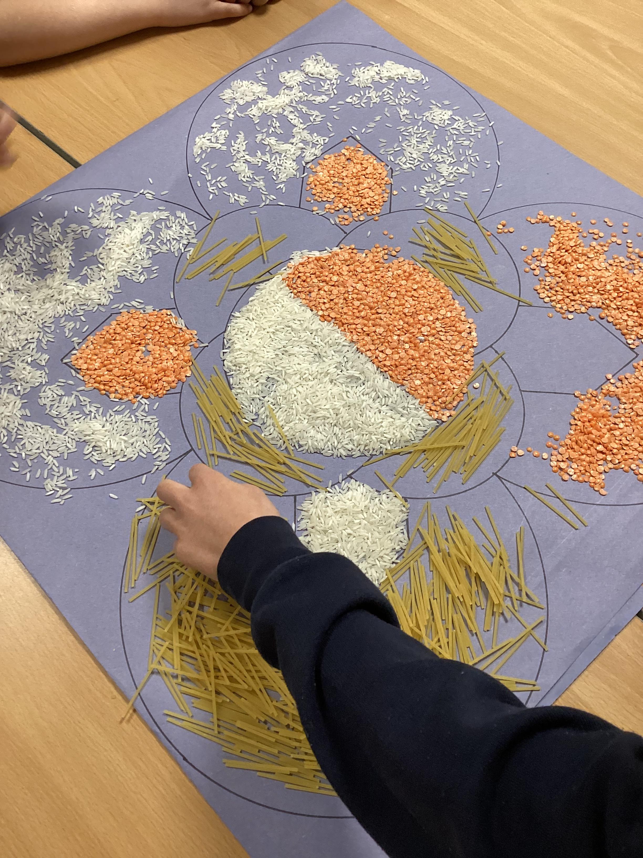 In RE we have been finding out about the Hindu festival of Diwali. Working together in groups, we made Rangoli patterns using pasta, rice and lentils. We were very pleased with the results.