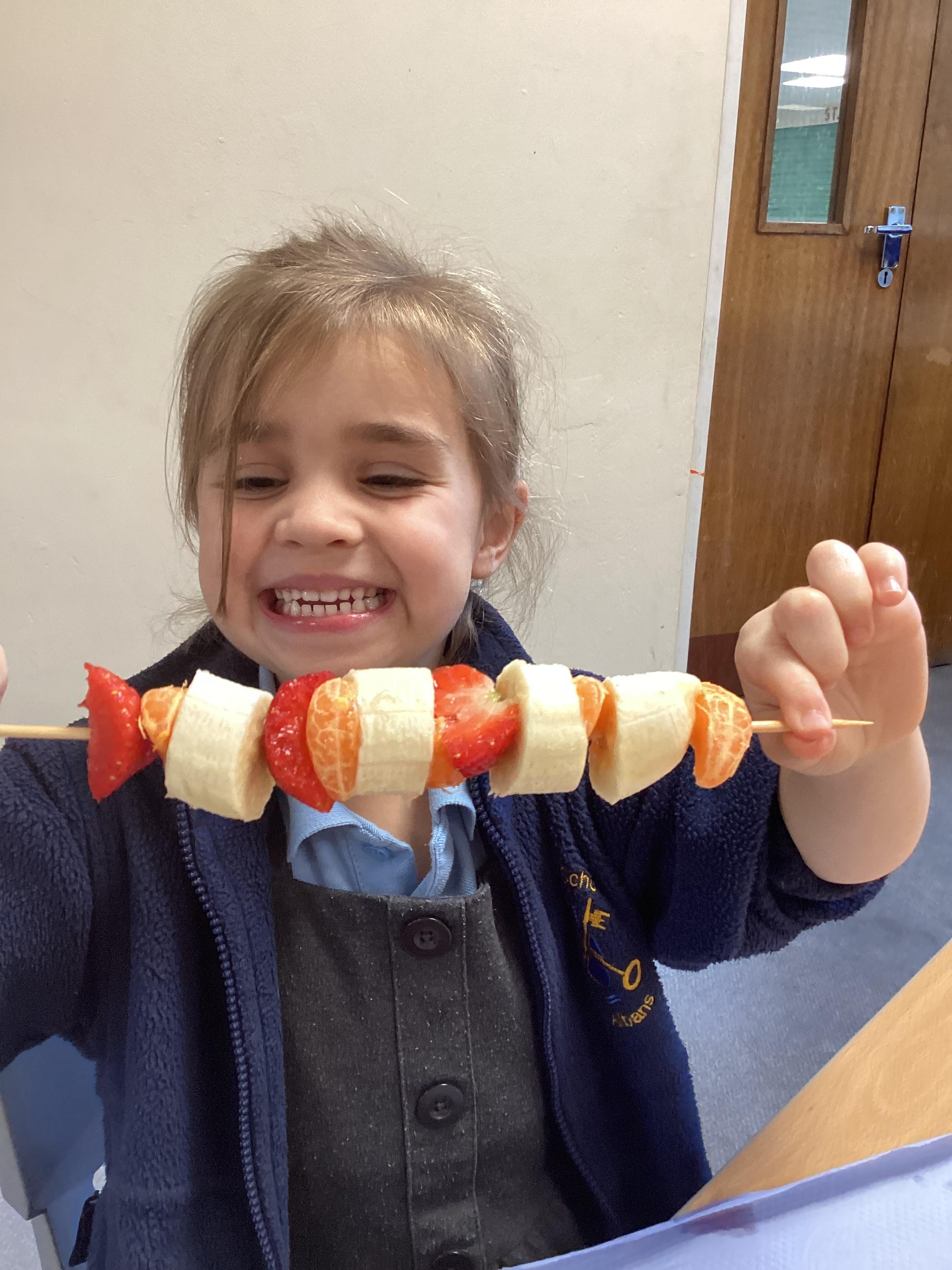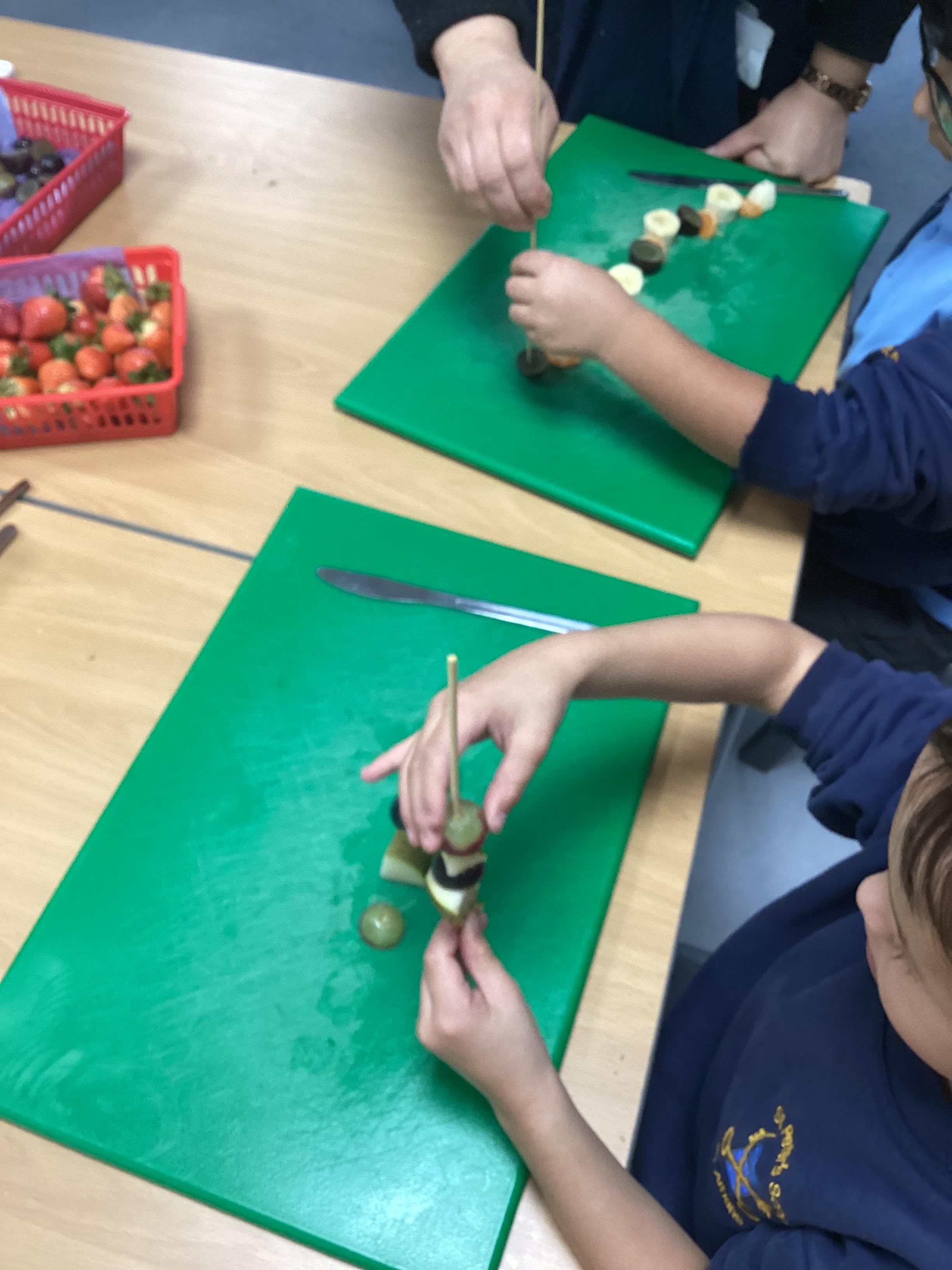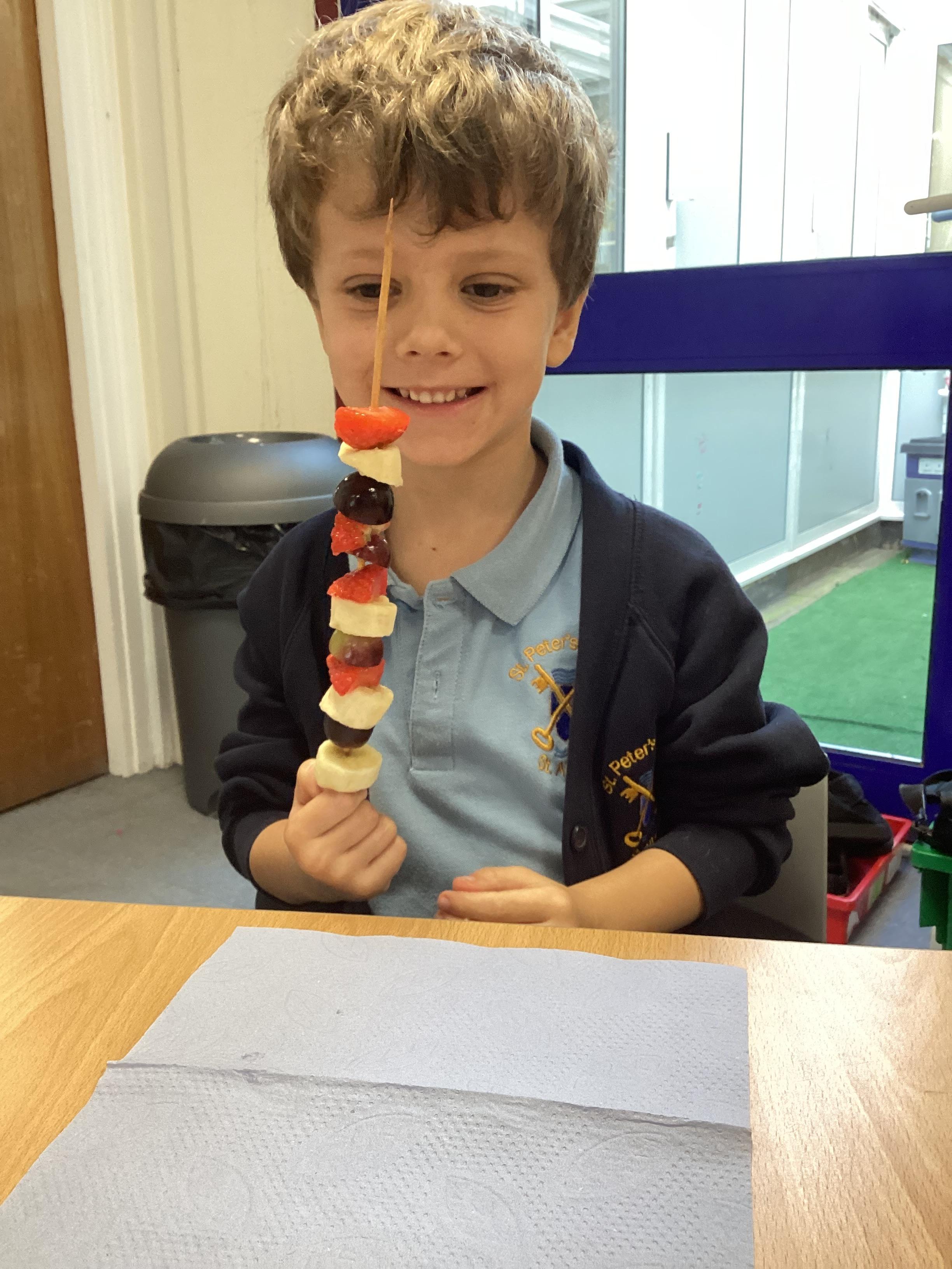 This week we have been making our fruit kebabs in Design Technology. We thought about our favourite fruits and practised our cutting skills with play dough. Then we tasted 5 different fruits and chose those we'd like to use on our kebab. Finally we made them and ate them!