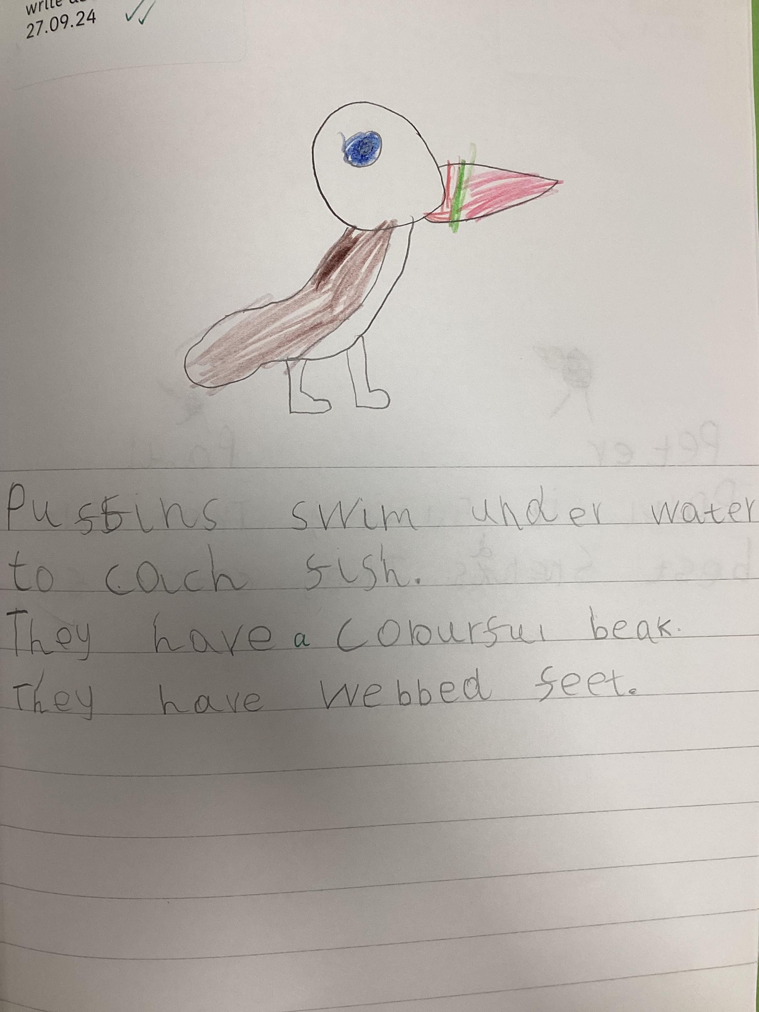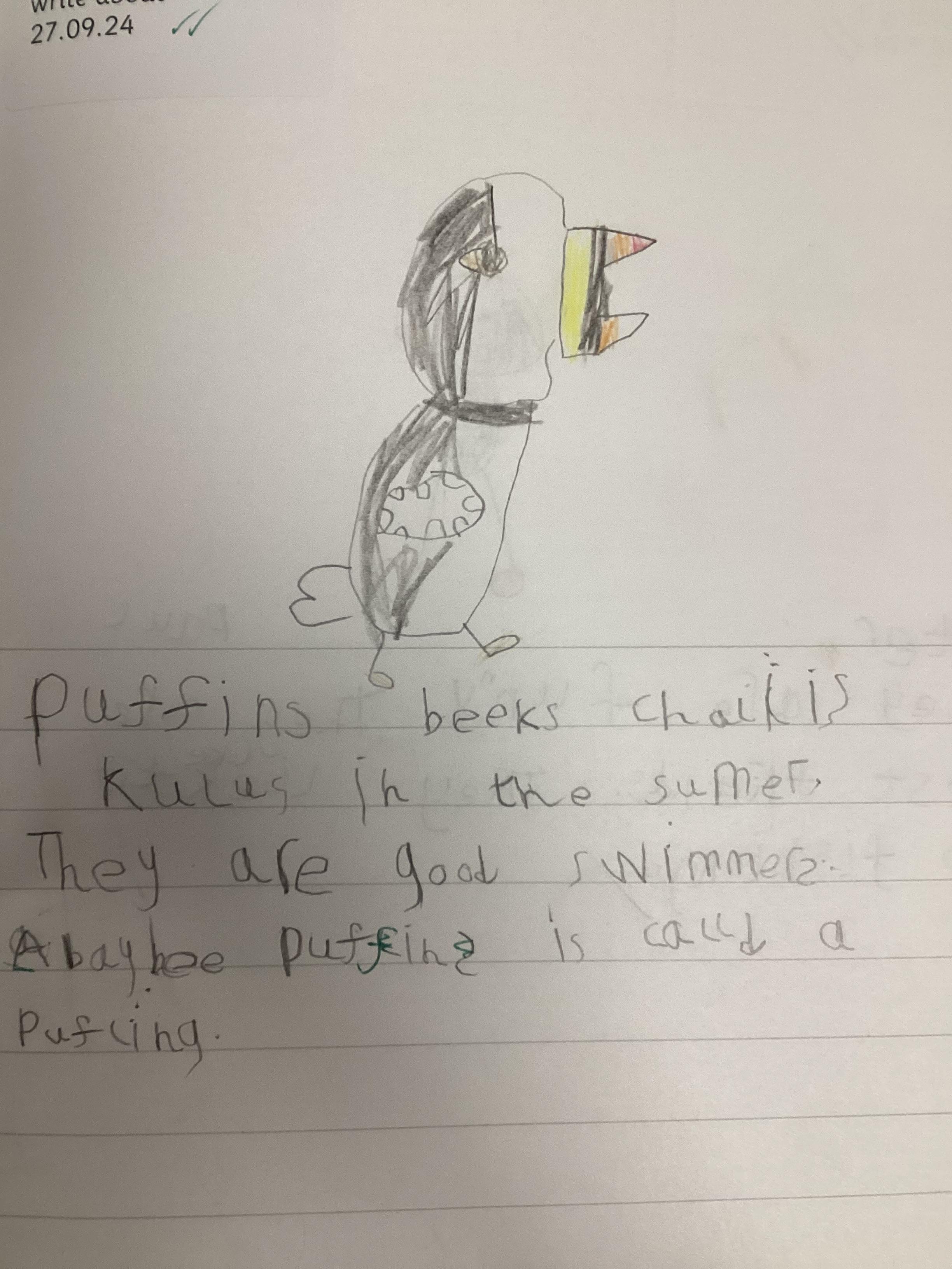 In Literacy, we have begun to read 'Puffin Peter' by Petr Horacek. We began by finding out about puffins. Here is some of our work.