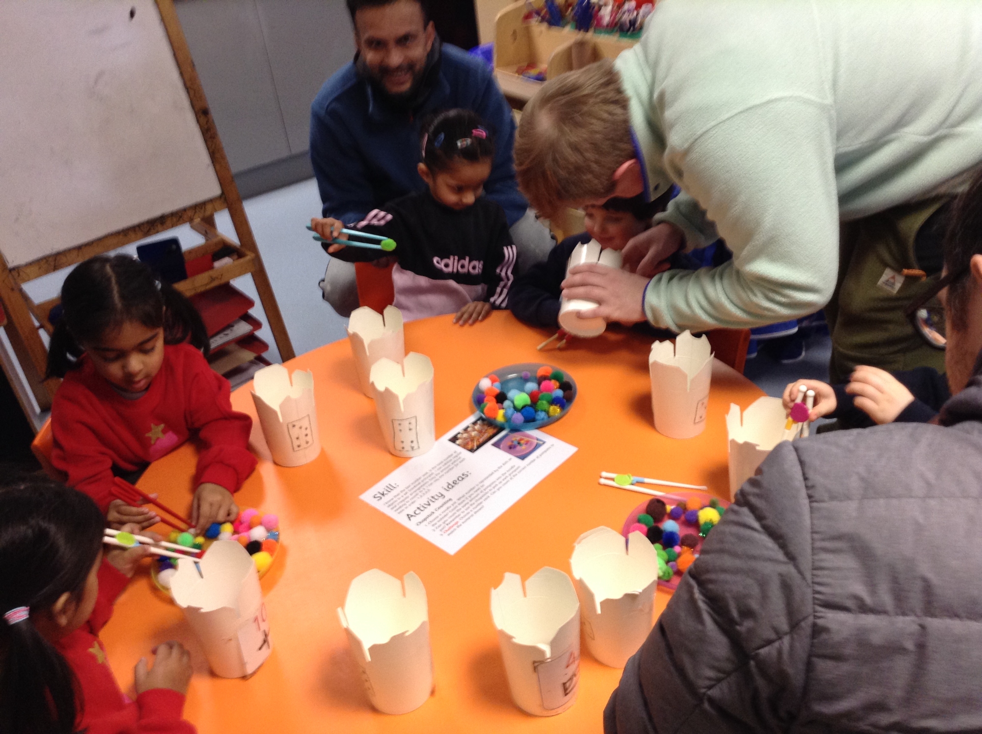 During 'Play and Learn' the children utilised their fine motor skills to count pompoms into noodle pots with chopsticks. The children also enjoyed playing in our Chinese Restaurant themed role-play area.