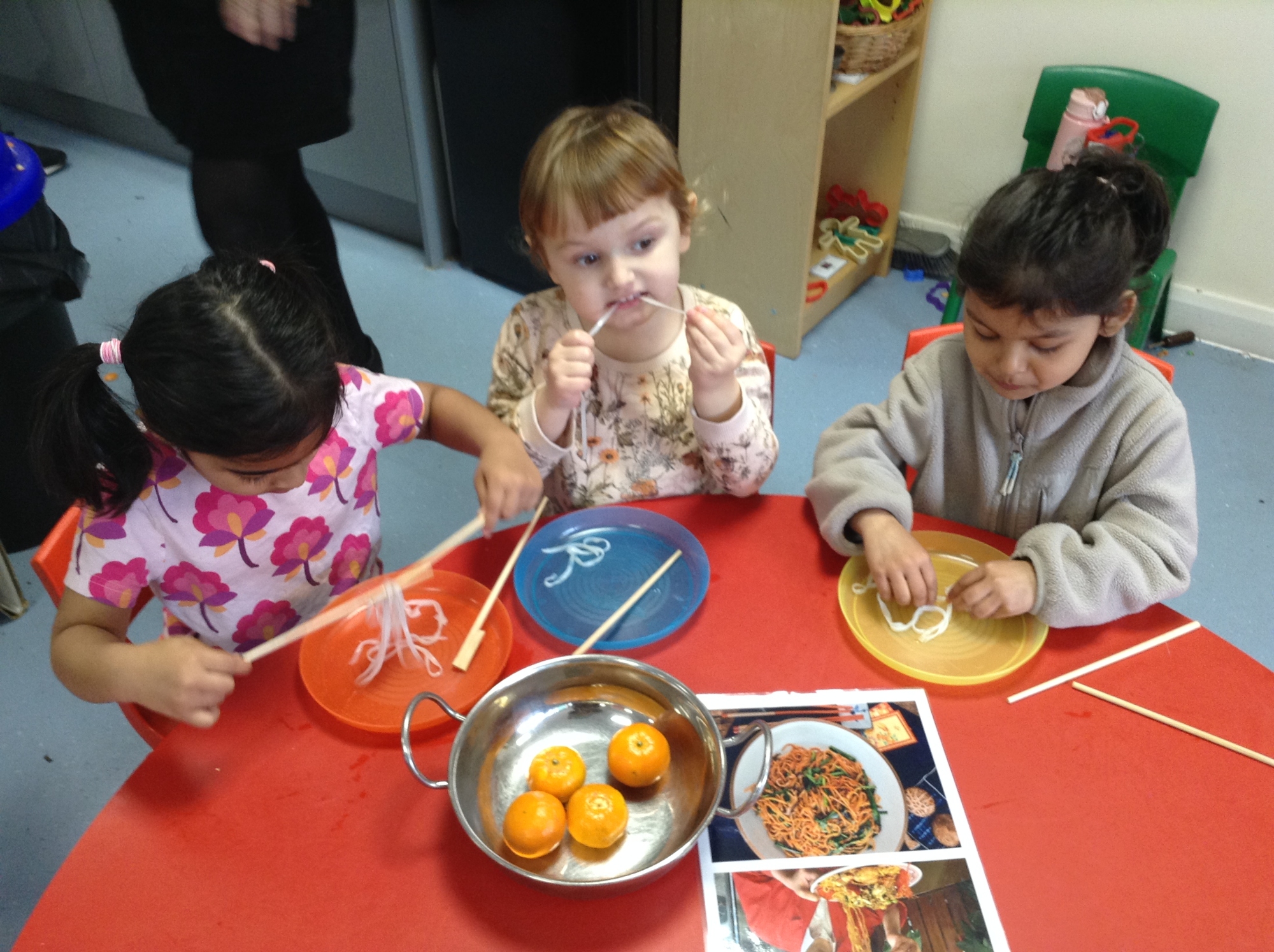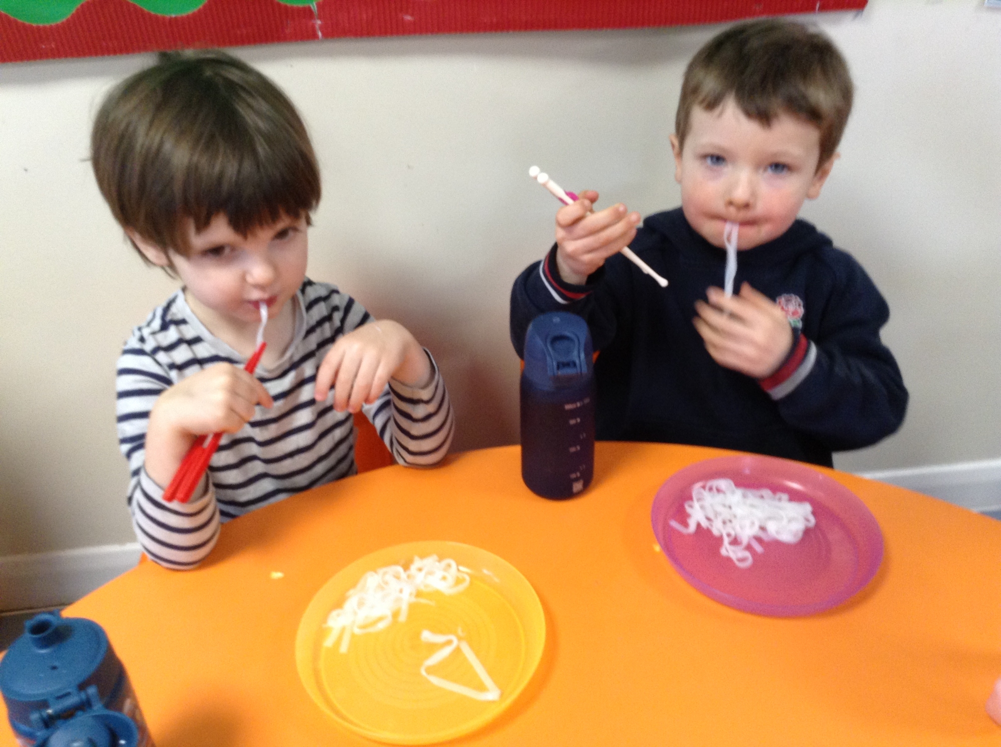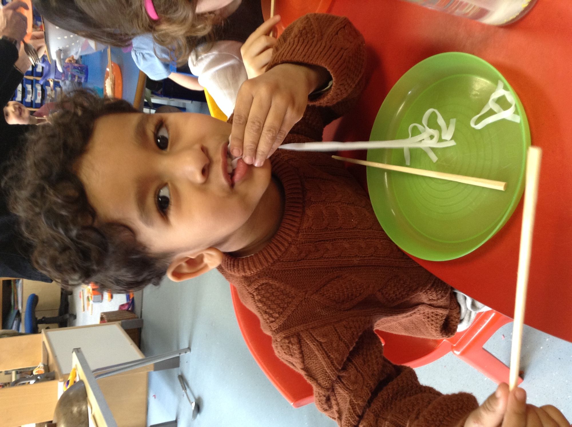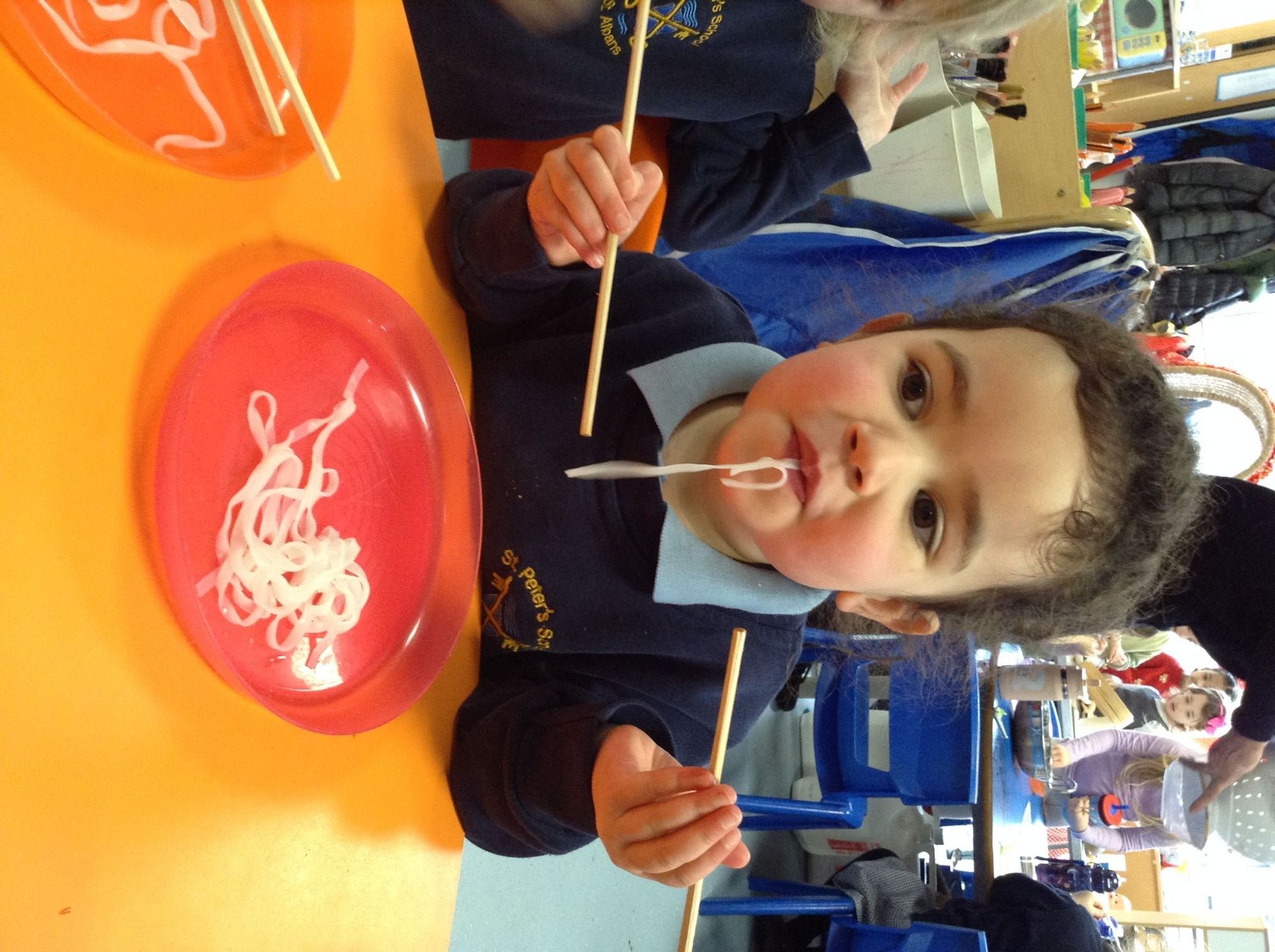The children tasted rice noodles with chopsticks and made some brilliant observations to compare what the noodles looked and felt like before and after they were cooked. They shared whether or not they had tried noodles before, gave opinions about how the noodles tasted and described some of the noodle dishes they eat at home.