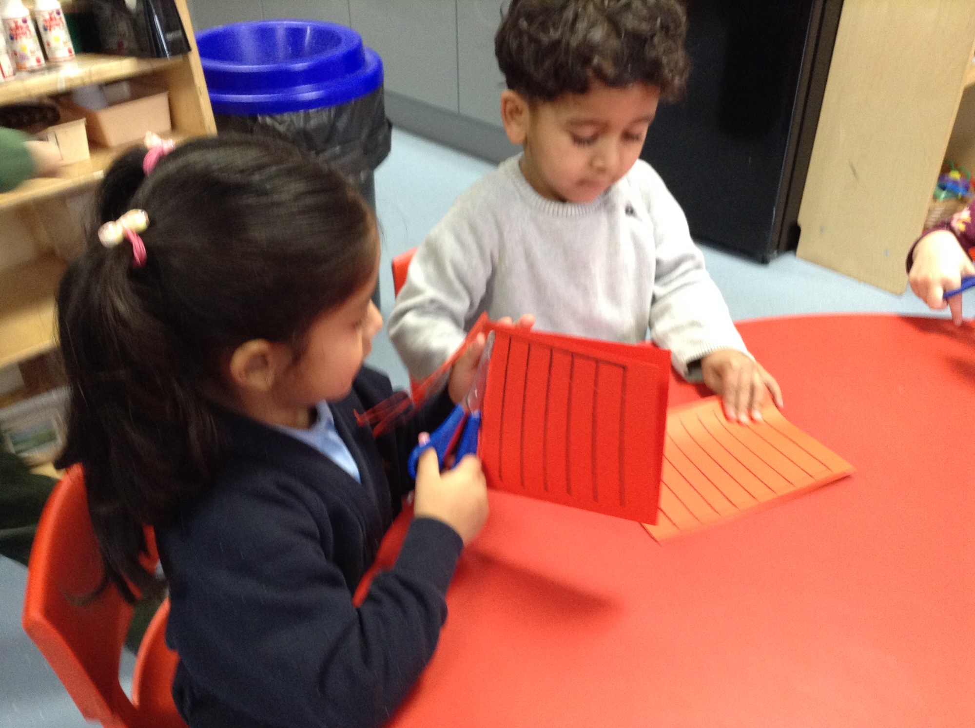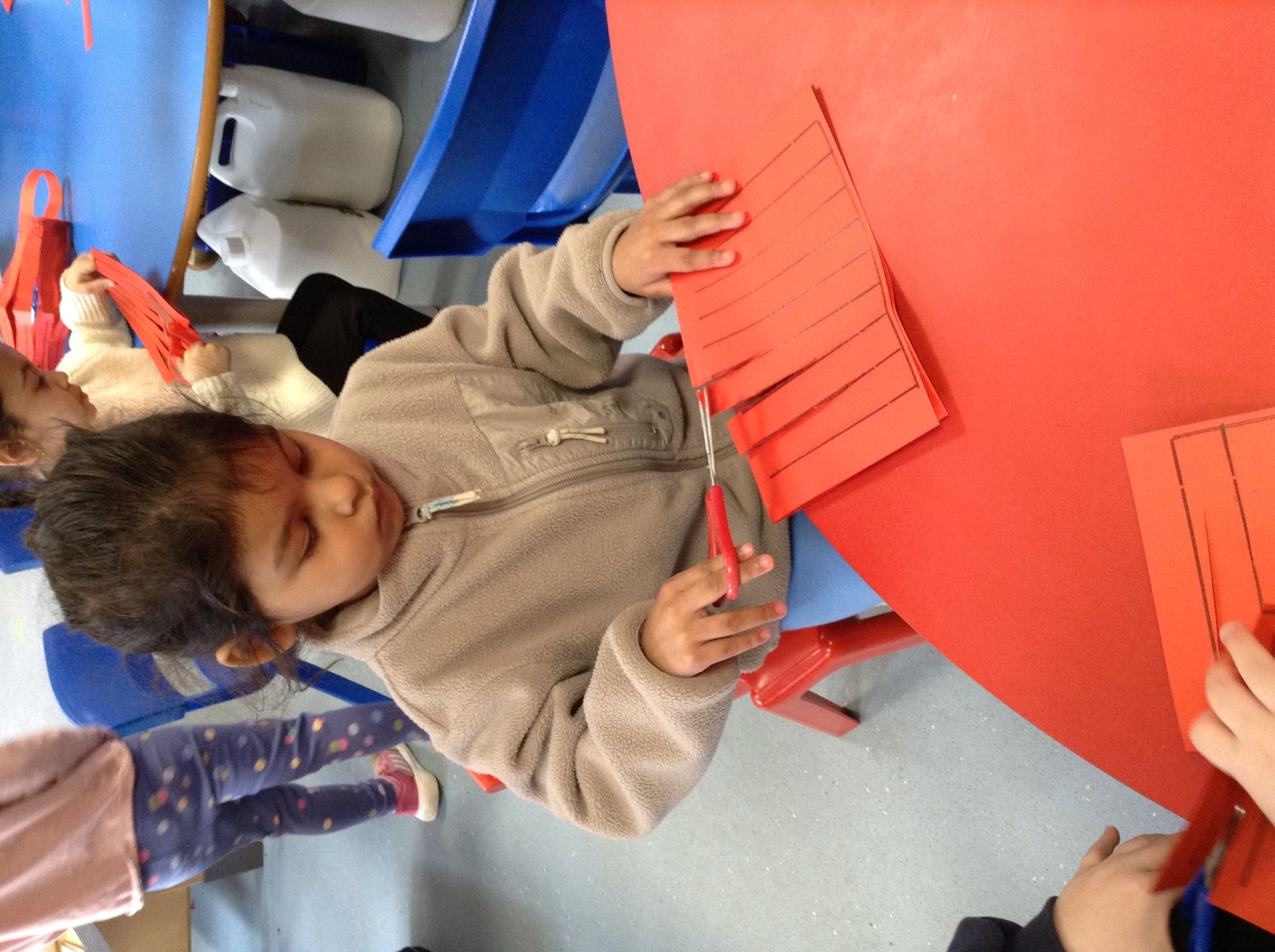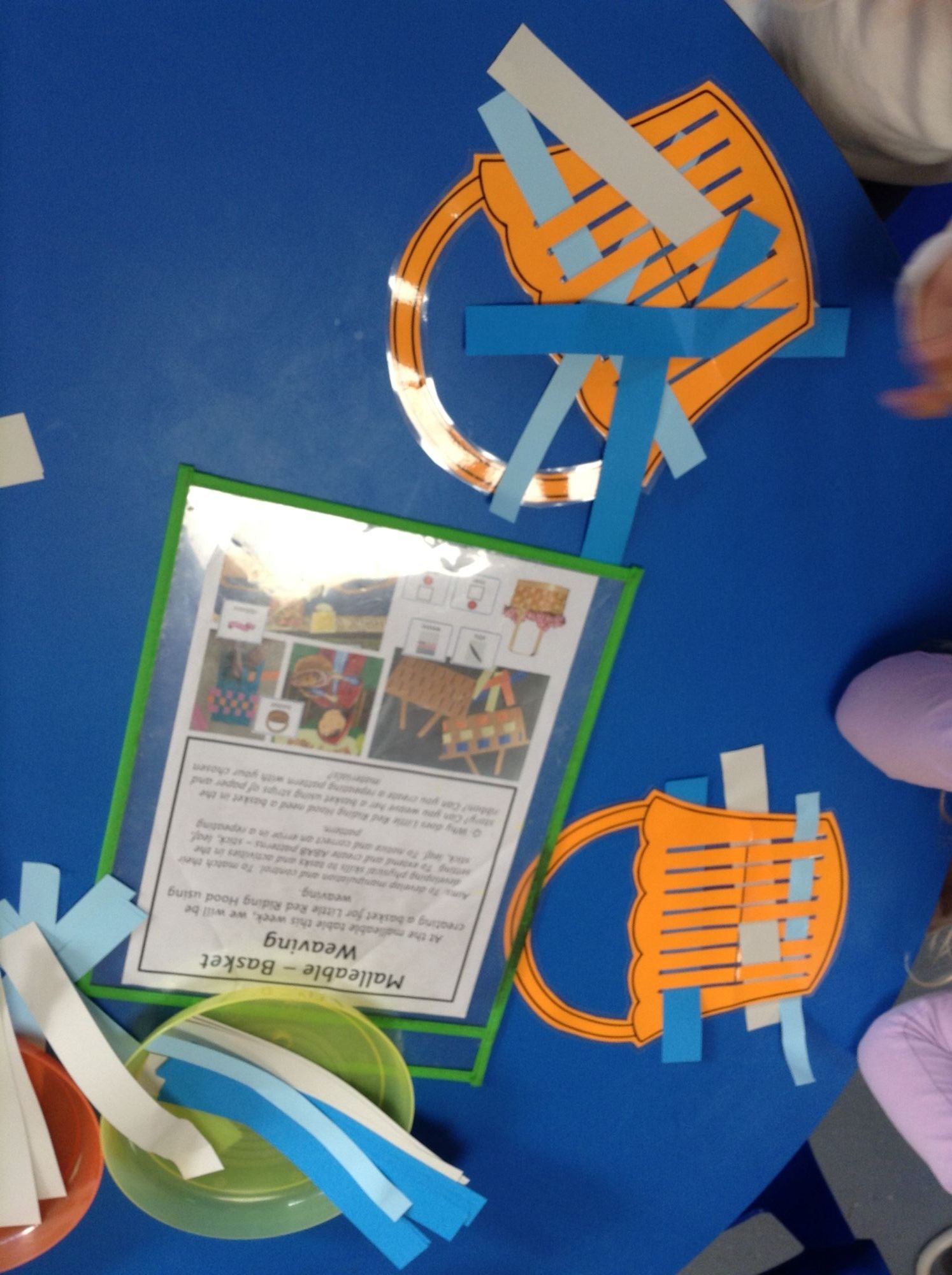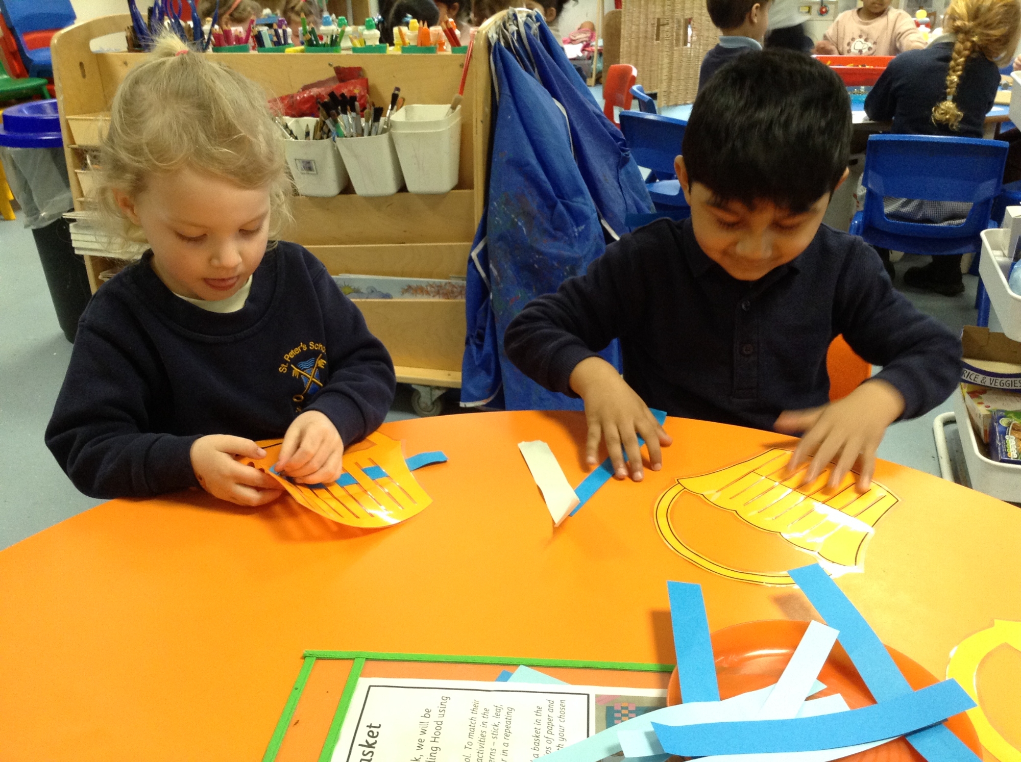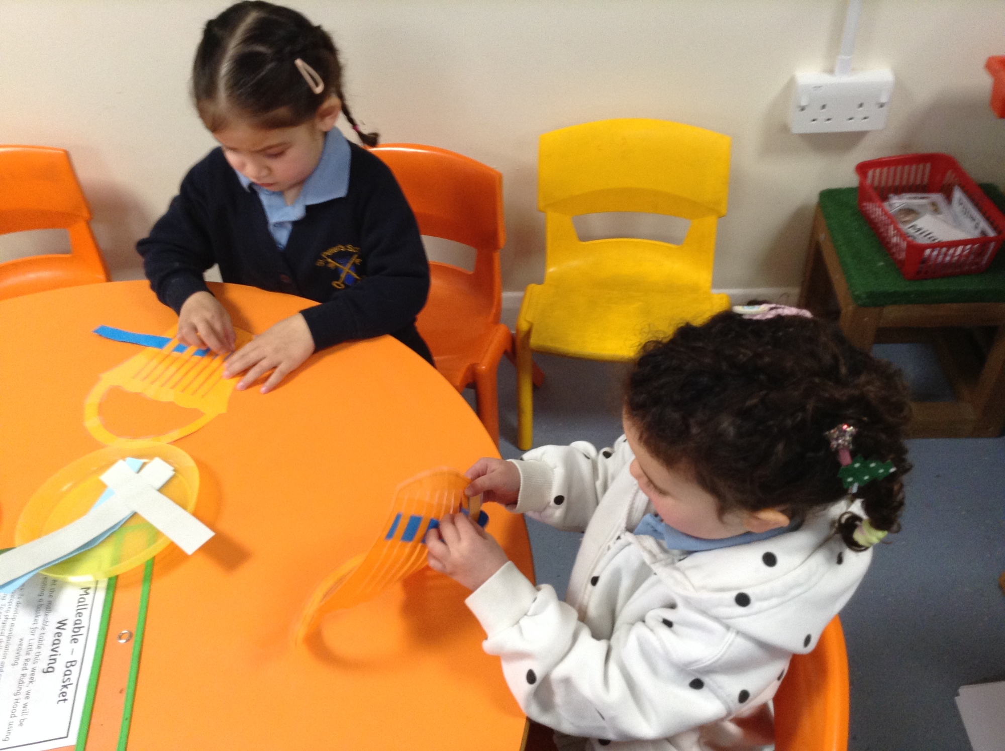 The children utilised their fine motor skills by making baskets for Little Red Riding Hood. We practised weaving strips of coloured paper, ribbons and pipe cleaners in and out of the slits in the baskets. Some of the children tried to create a repeating pattern when choosing the order in which they wove the different materials.