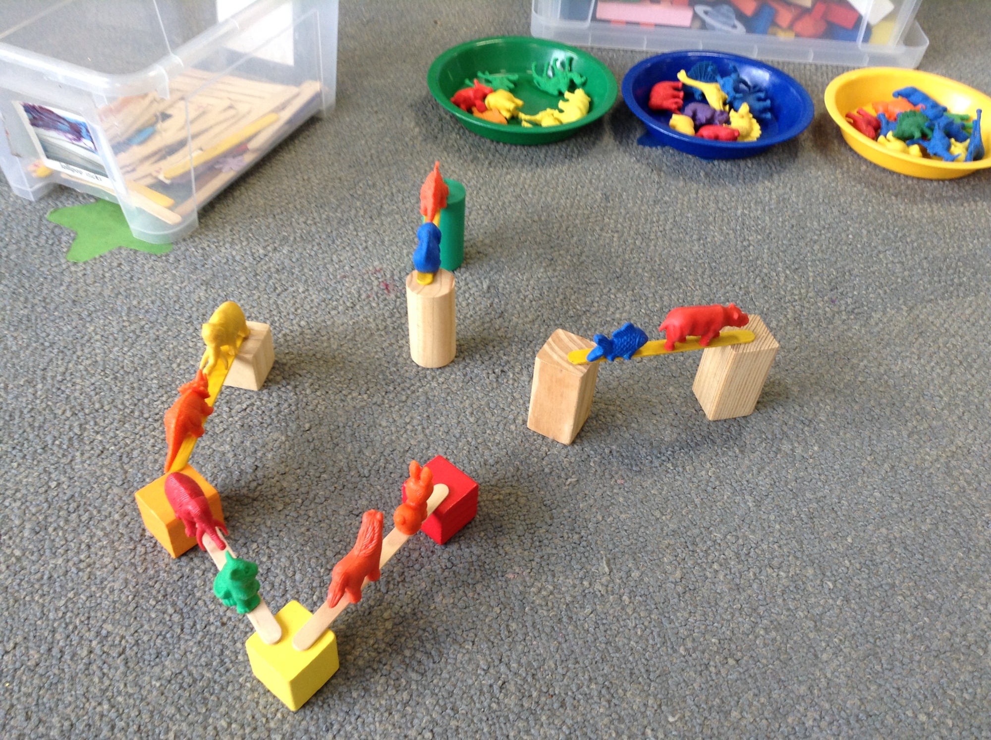 During 'Busy Fingers' the children had fun creating bridges using wooden blocks and lollipop sticks and utilising their fine motor skills to balance animals on the bridges without knocking them down.