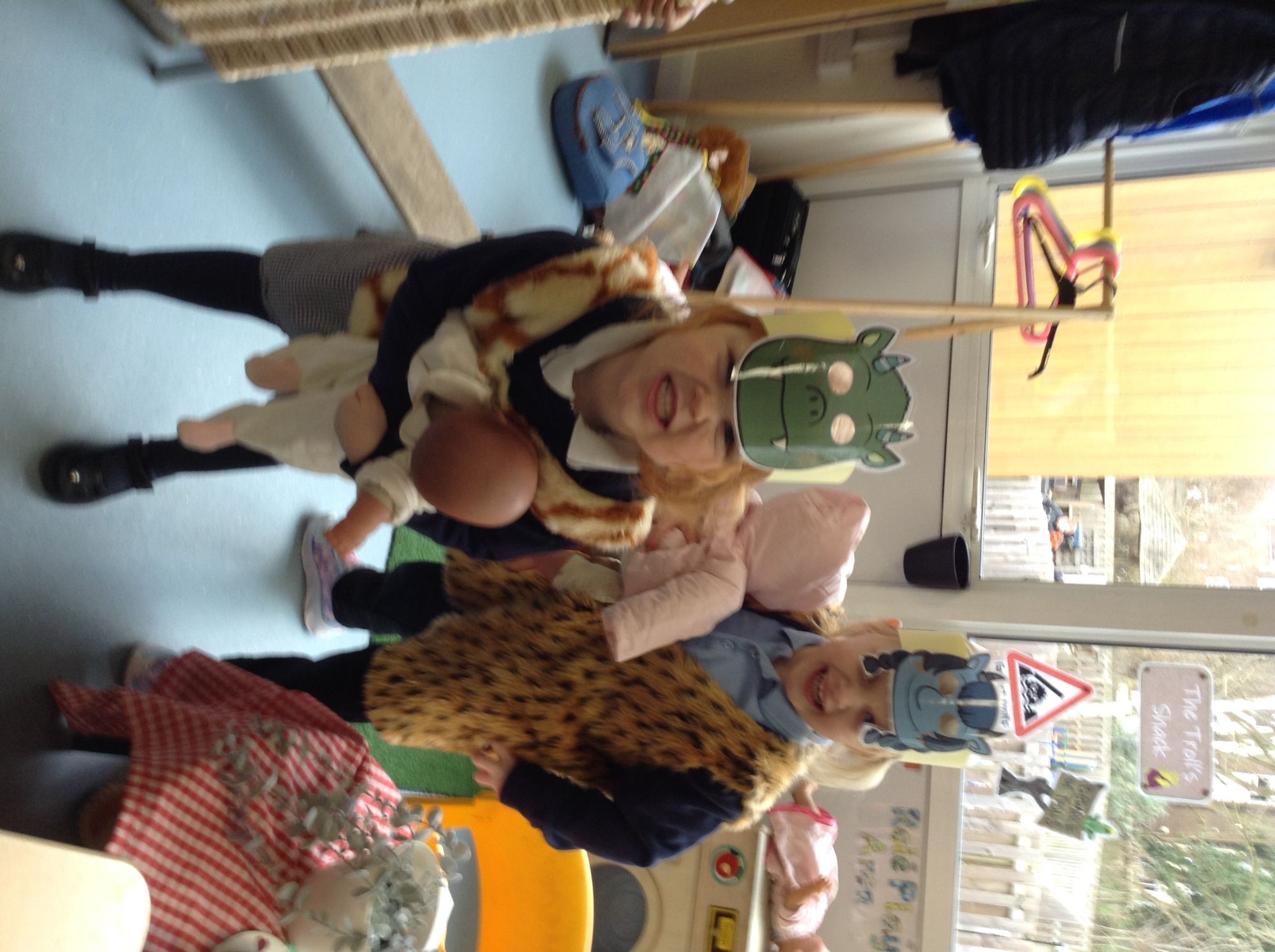 The children had opportunities to re-tell the story of 'The Three Billy Goats Gruff' with small world characters in the tuff tray and whilst dressing up in the role-play area.