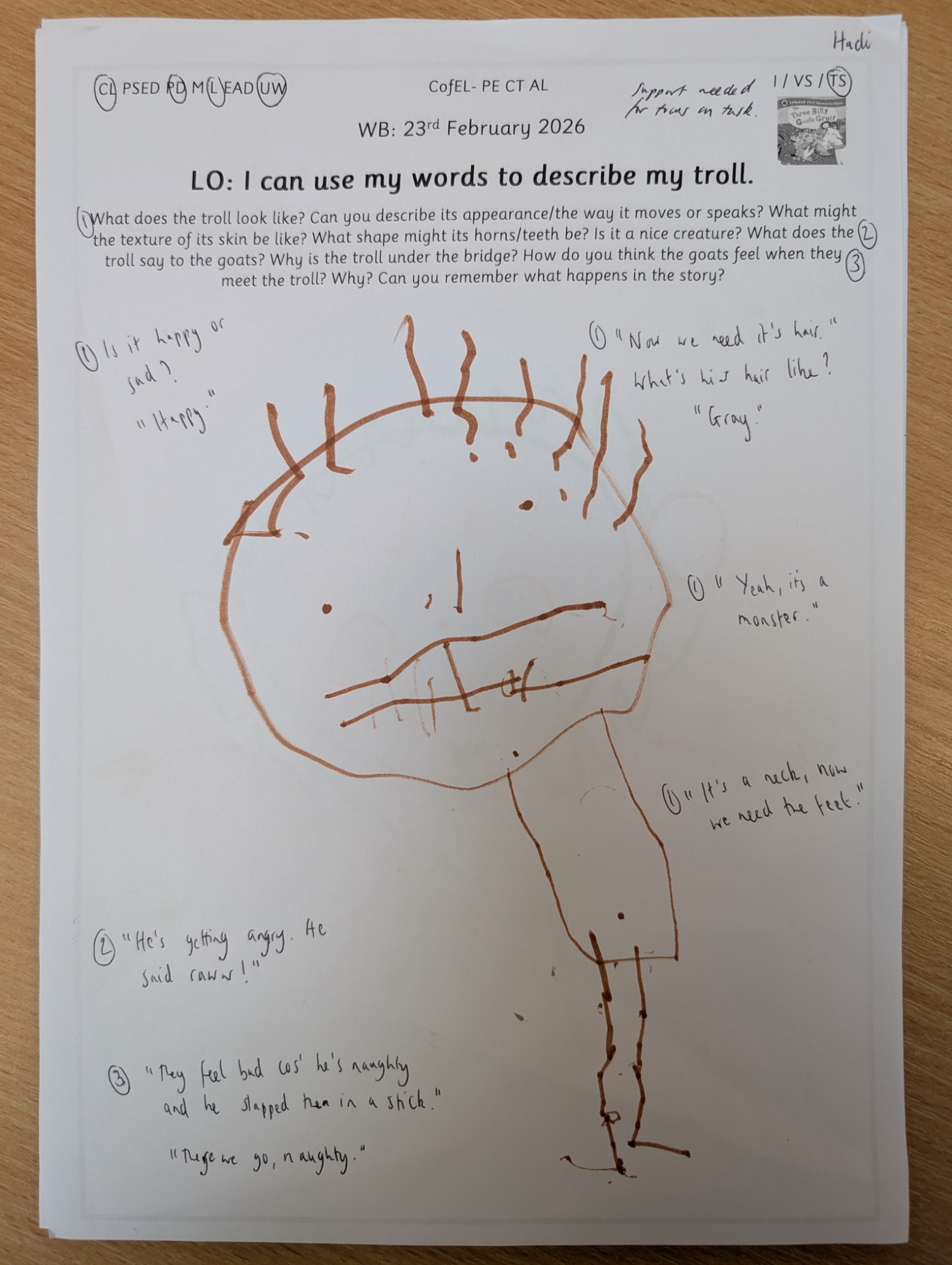 The children imagined how their trolls would move, whether they were horrible or friendly, what they would say to the Billy Goats and how they would make the goats feel.