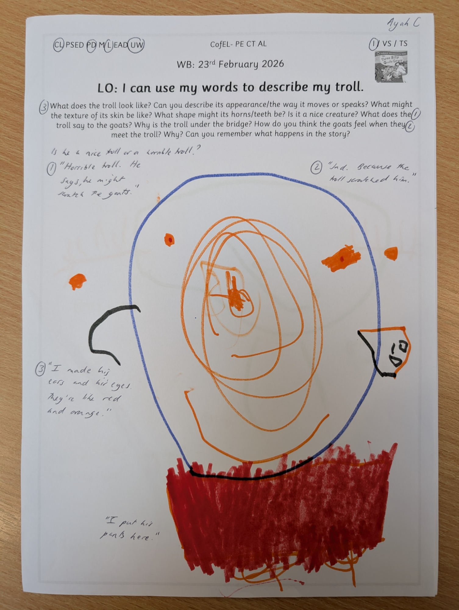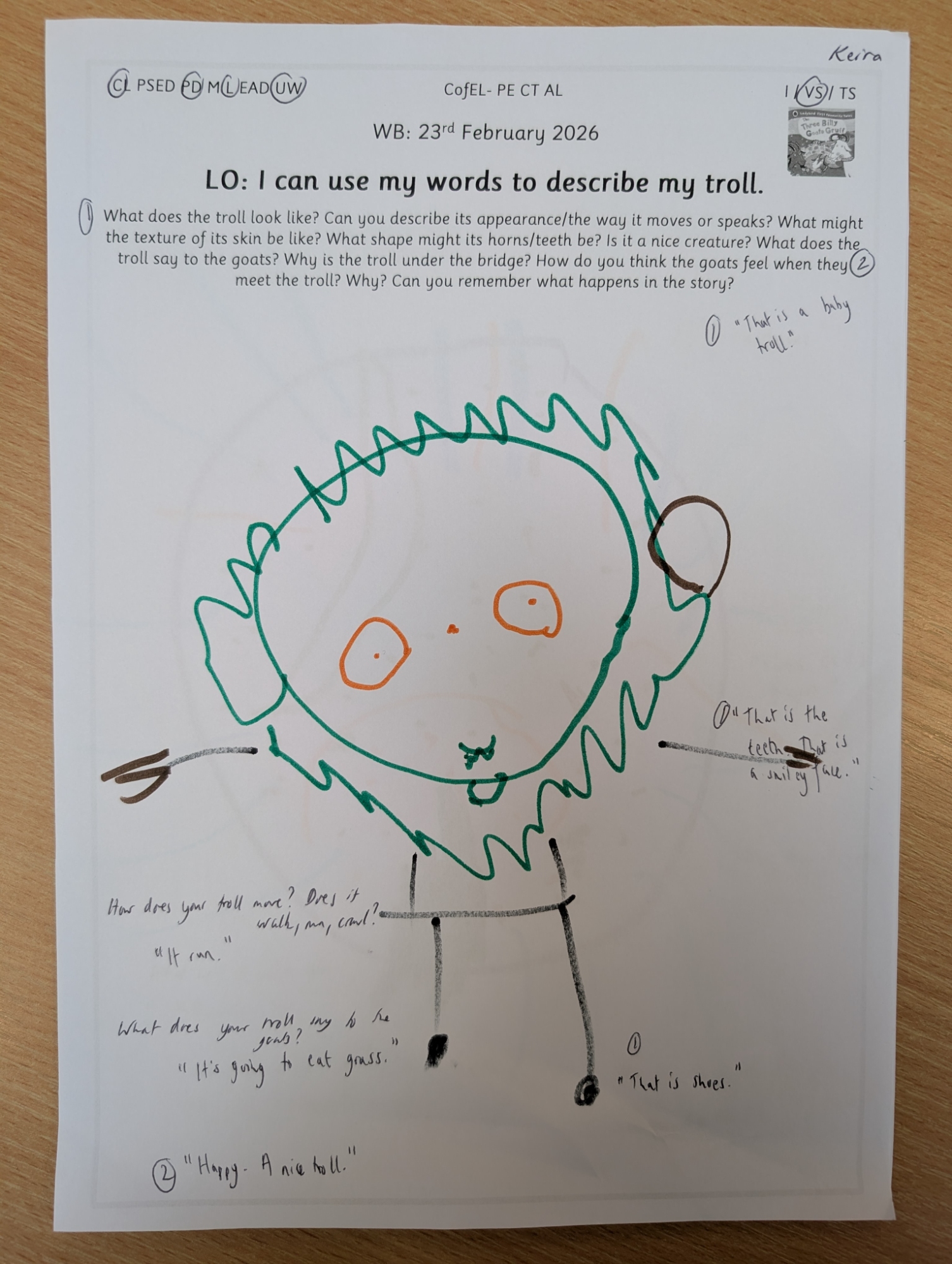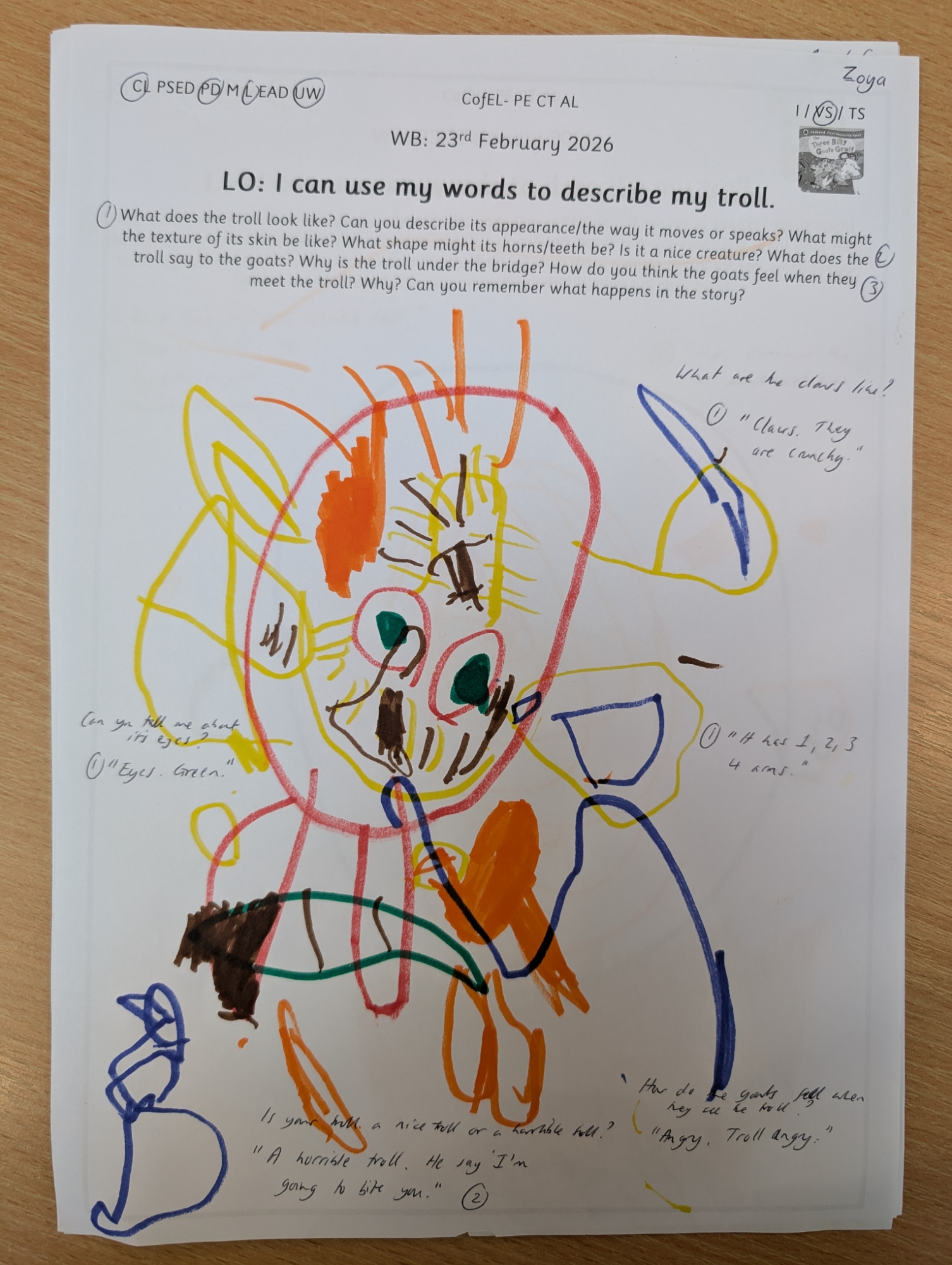 Inspired by our story of the week, Nursery enjoyed drawing their own trolls and describing both their appearance and personality using adjectives.