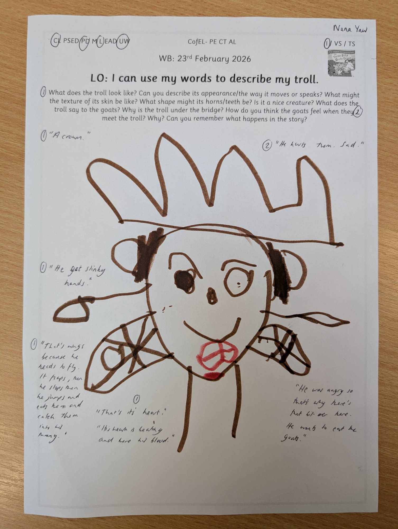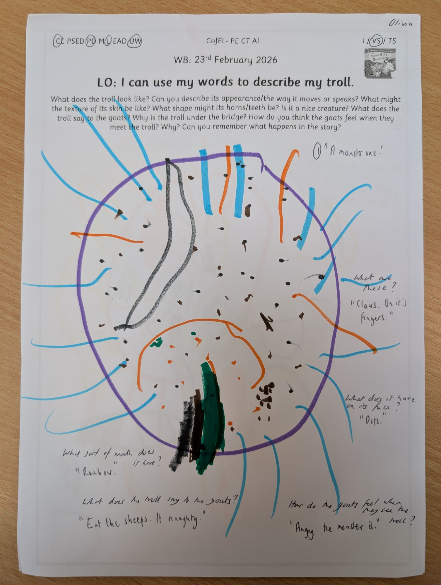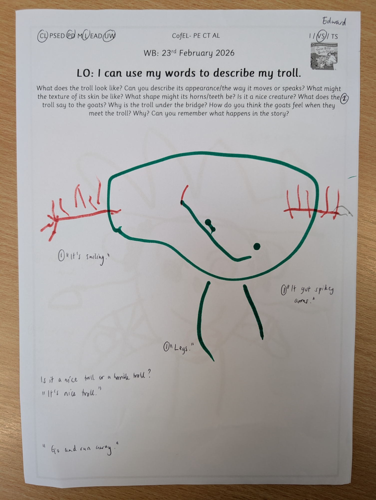 Inspired by our story of the week, Nursery enjoyed drawing their own trolls and describing both their appearance and personality using adjectives.