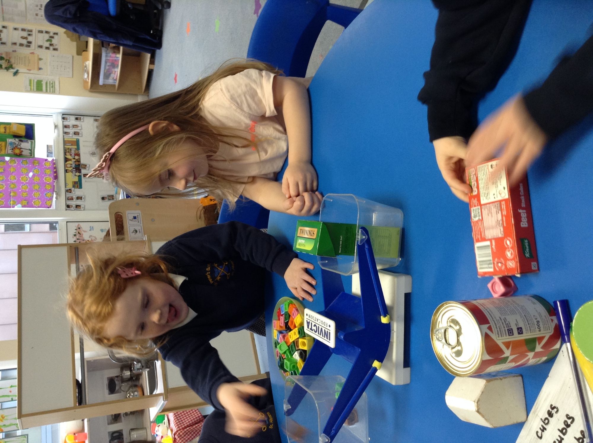 We then compared the mass of different items using balance scales. We noticed that the scales went down if an item was heavy, meaning that the heavier piece of food was lower than the lighter piece of food. If the scales did not move at all, we discovered the scales were 'balanced', meaning the items had the same mass, neither was lighter nor heavier than the other.