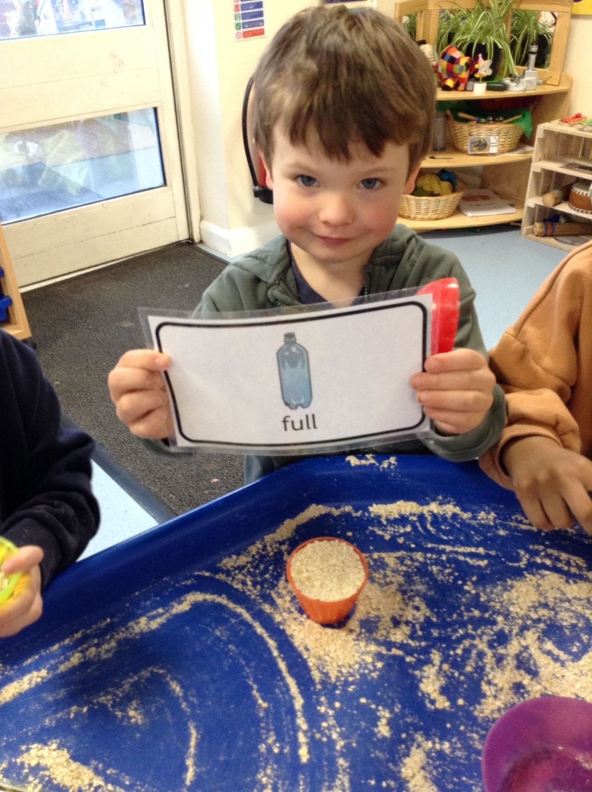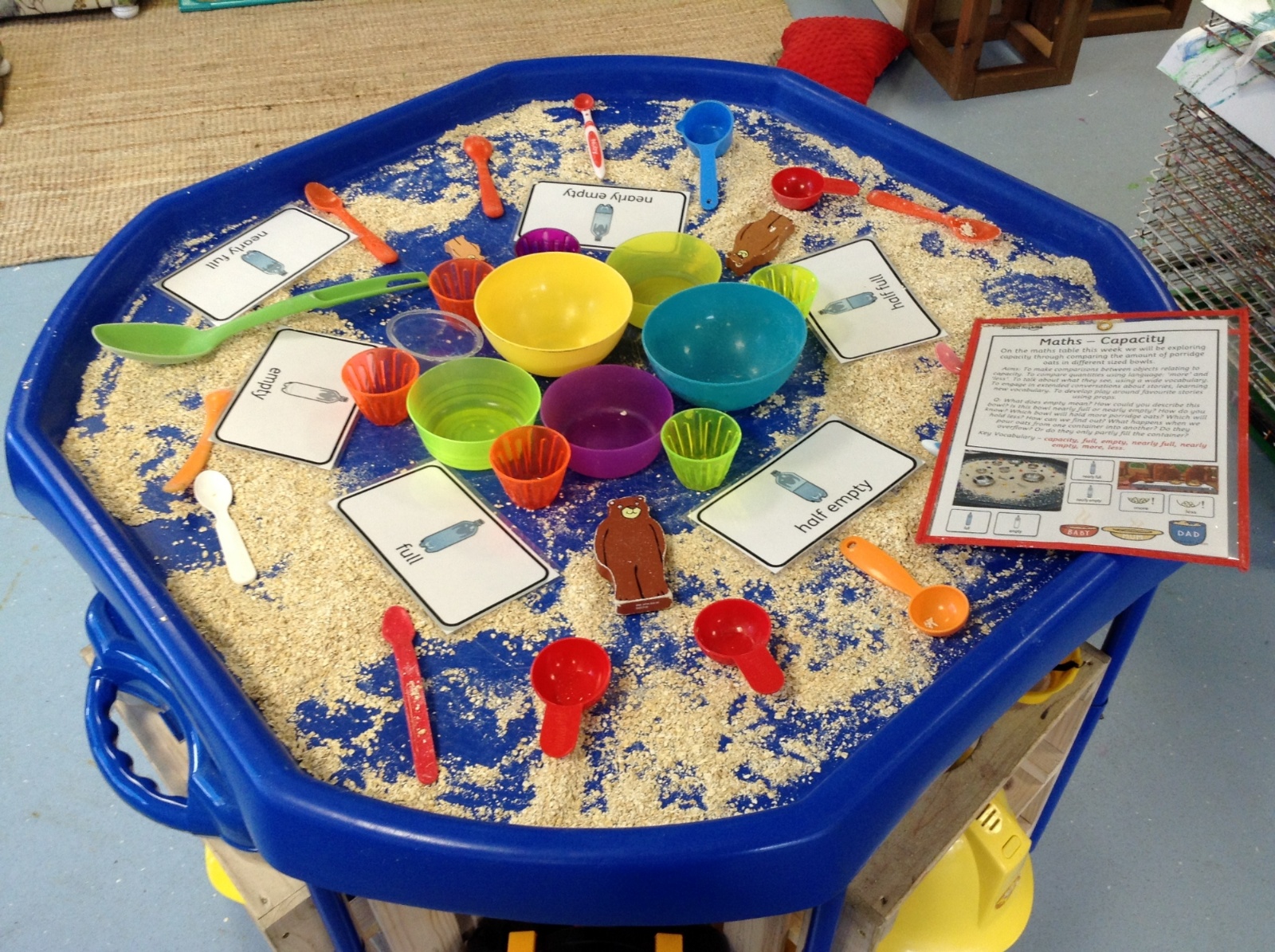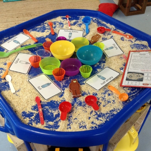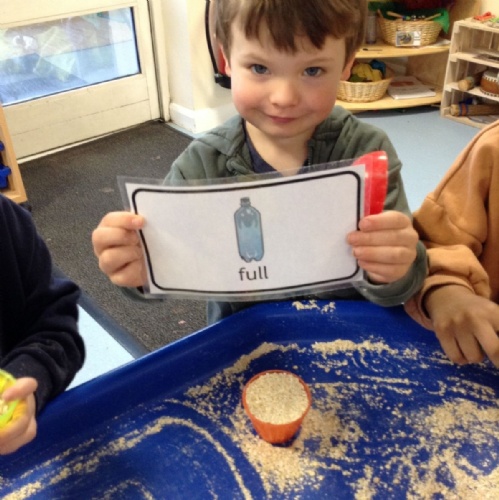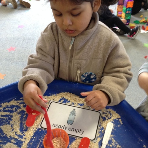 In maths this week we have been exploring capacity. The children enjoyed comparing the amount of porridge oats in different bowls using the words 'full', 'empty,' 'nearly full' and 'nearly empty'. They also investigated what would happen if they poured the porridge oats from one bowl into another. Sometimes the oats would overflow and other times the oats would only partially fill the second container. We could then determine which bowl held 'more' and which held 'fewer' oats.