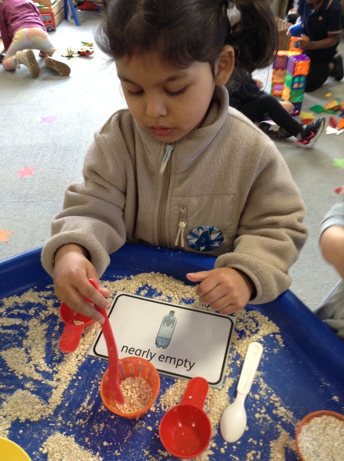 The children took their maths learning about capacity into their play, as well as comparing the amount of water left in their bottles at the end of snack time.