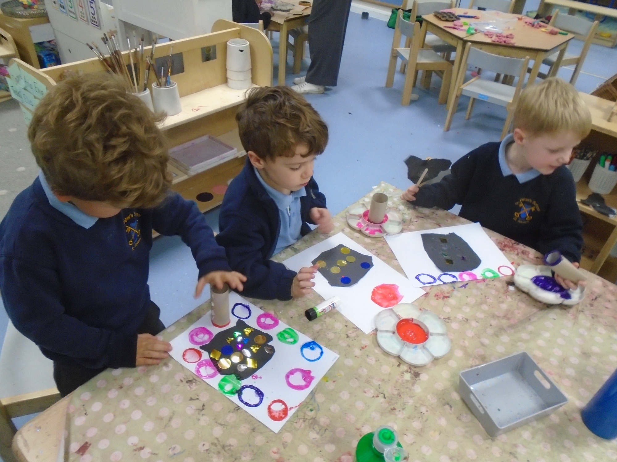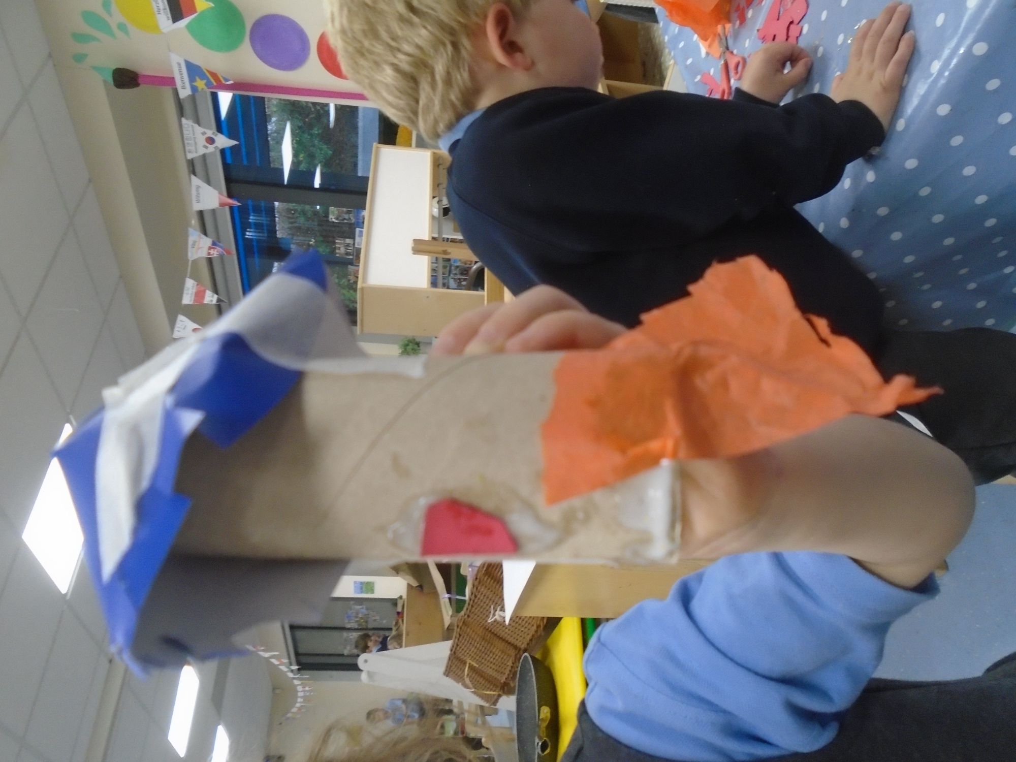 This week we have been reading 'Firework Poem' by James Carter and exploring how we can use onomatopoeia to create our own poems by describing the different sounds that fireworks make. We have also been working on developing our attaching skills using different techniques such as glue or tape to build our own rockets out of junk modelling.