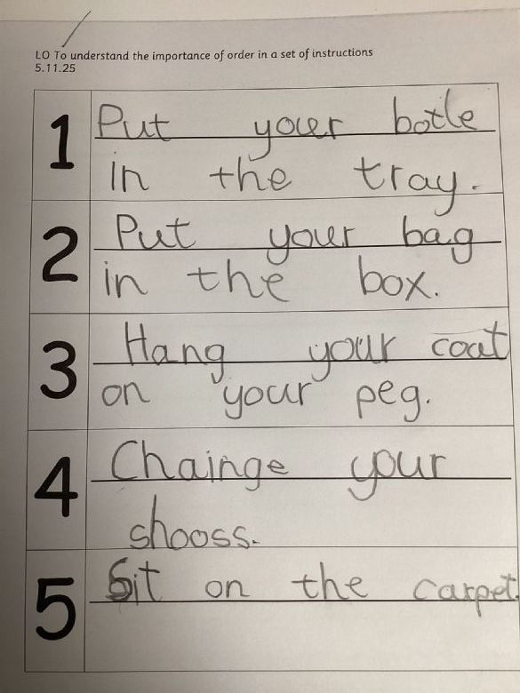 Our emotional literacy word of the week is "loved". This week we have been learning how to give clear instructions by looking at the book Gruffalo Crumble by Julia Donaldson. Today we imagined what instructions the Gruffalo would need if he joined our class!