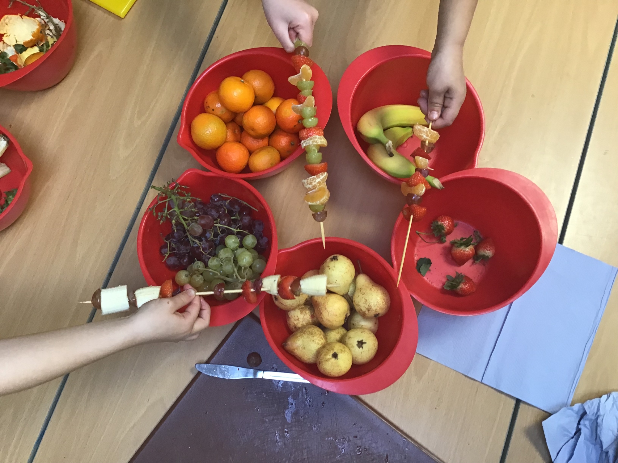 This week in Design and Technology we talked about making a healthy snack before practising our cutting skills. We tasted 5 different fruits to decide which we liked the best. We peeled, chopped and lined up our fruit to make a pattern before putting it onto a stick. Finally we were able to eat and enjoy it!