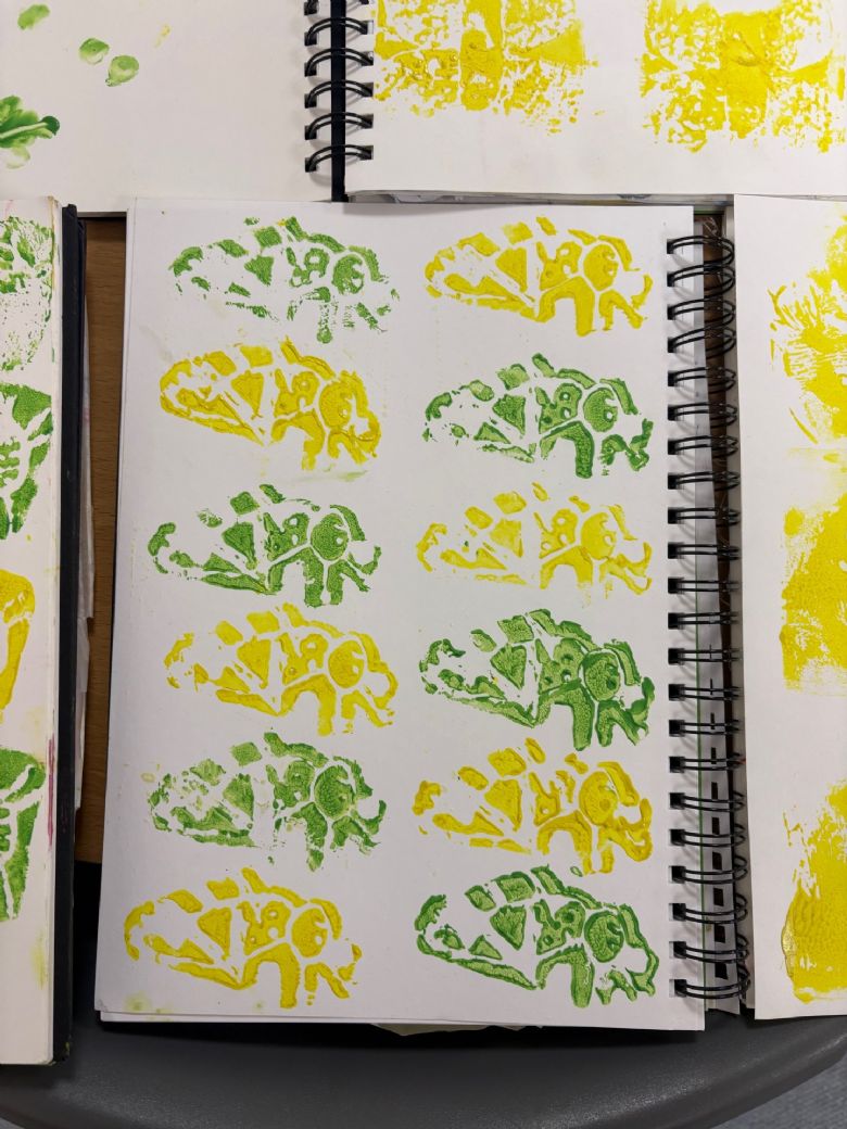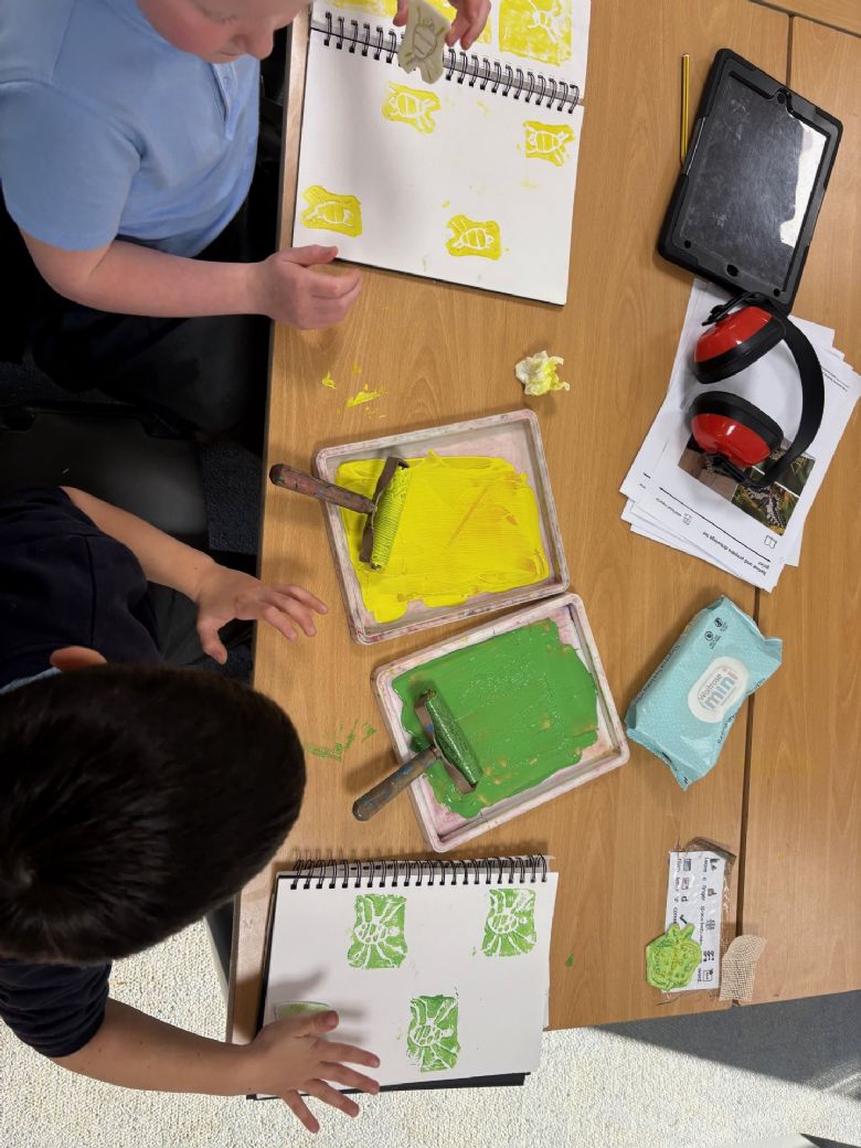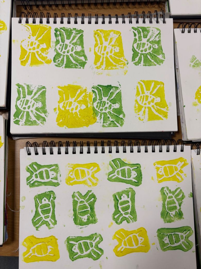 We explored repeating patterns in Art yesterday, developing our insect prints from last week by cutting out our foam plate and using two different colours to improve the visual appeal.