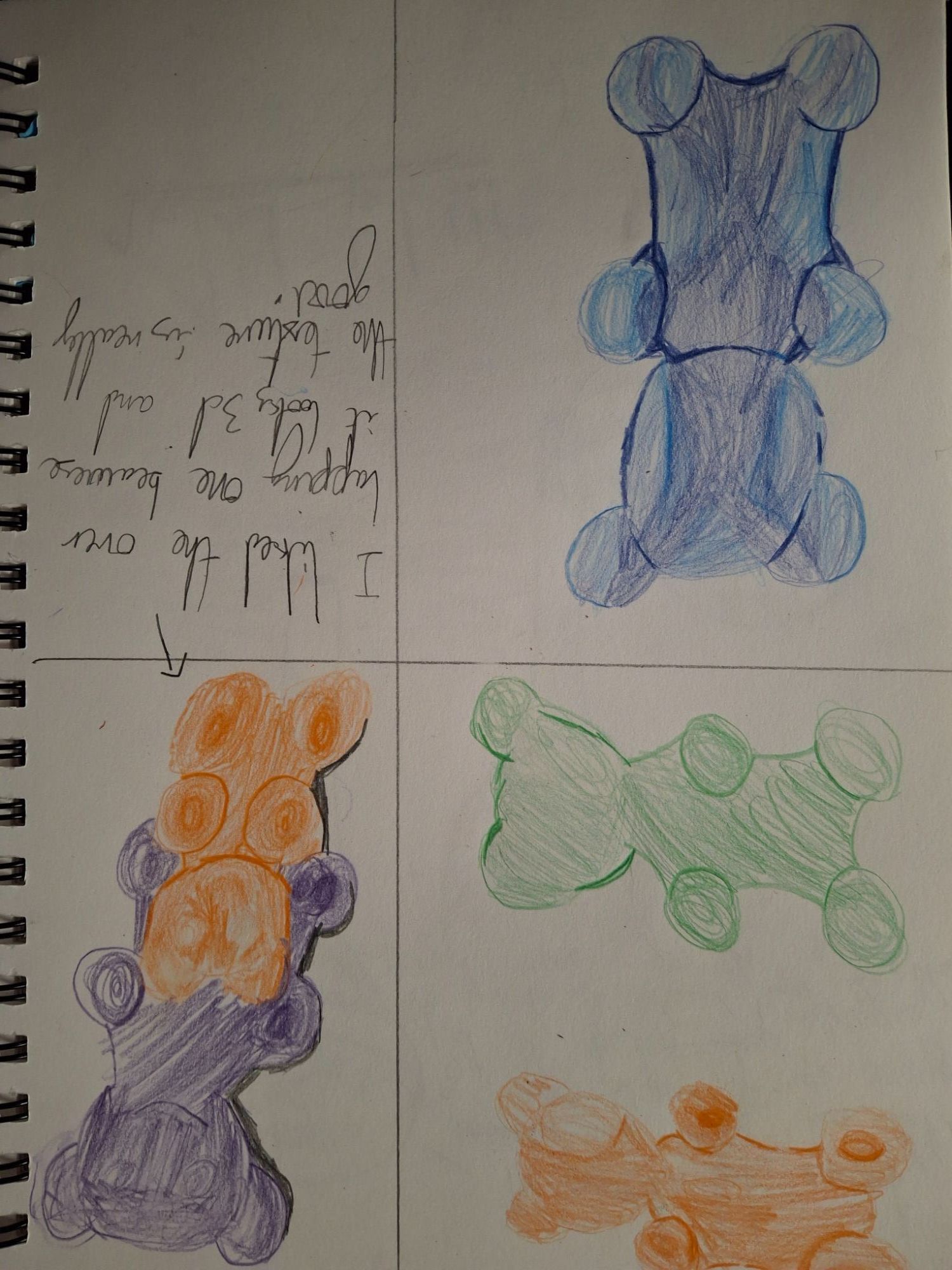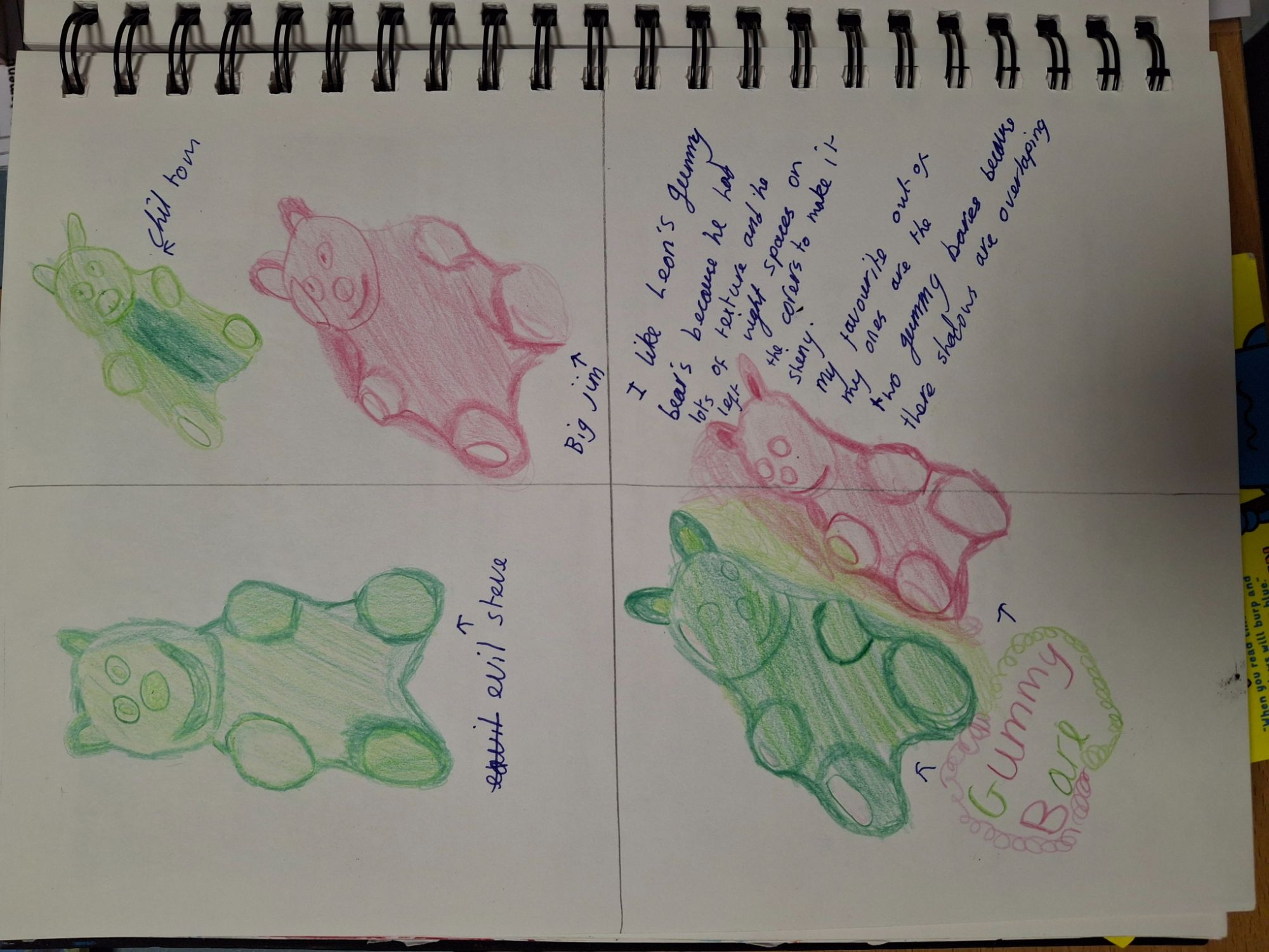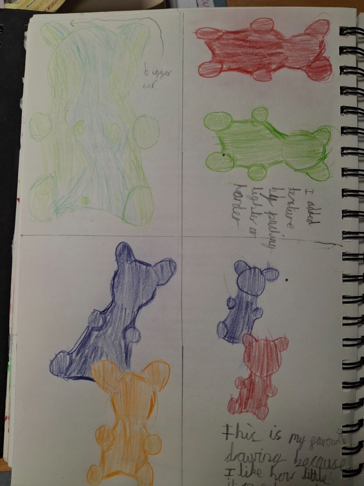 Last week, we started our new Art unit 'Drawing & Painting'. Last week, the children were focussing on their observational skills (more looking than drawing) and attempting to copy hard candy as well as a Chupa Chups lollipop. Our vocabulary for this lesson was: shape, outline and proportion. This week, we added texture and composition to our vocabulary and the children tested their skills in drawing gummy bears: