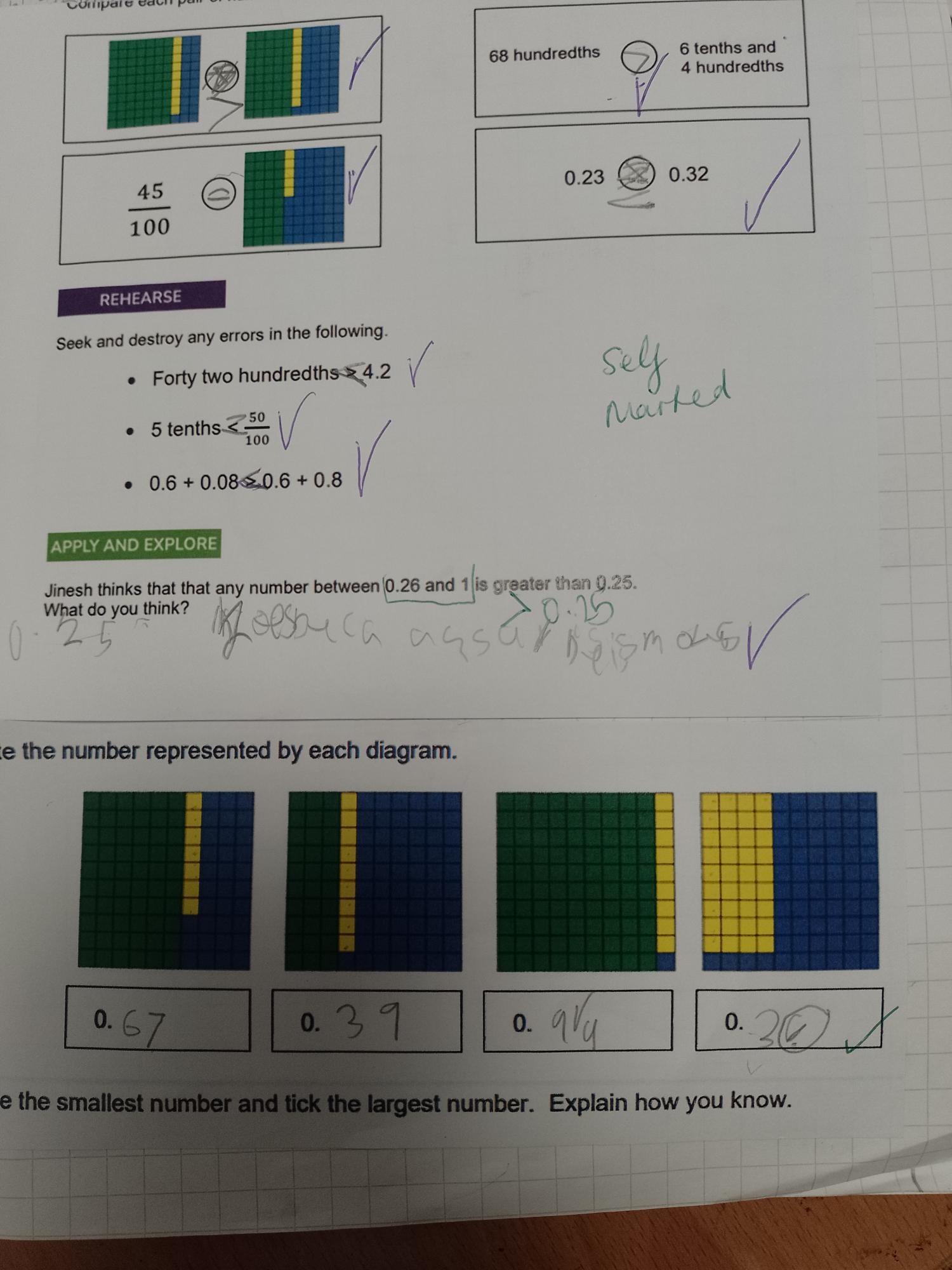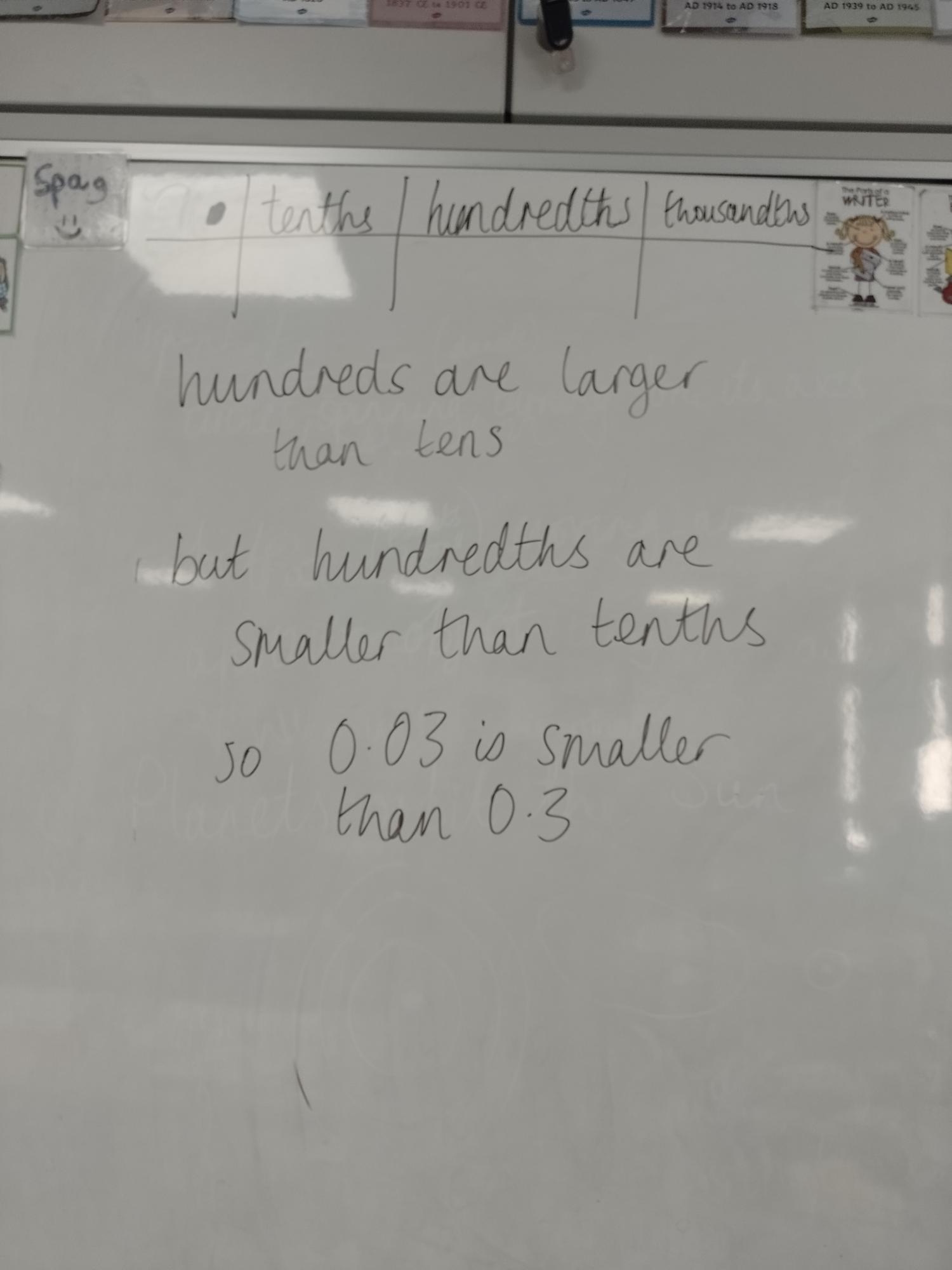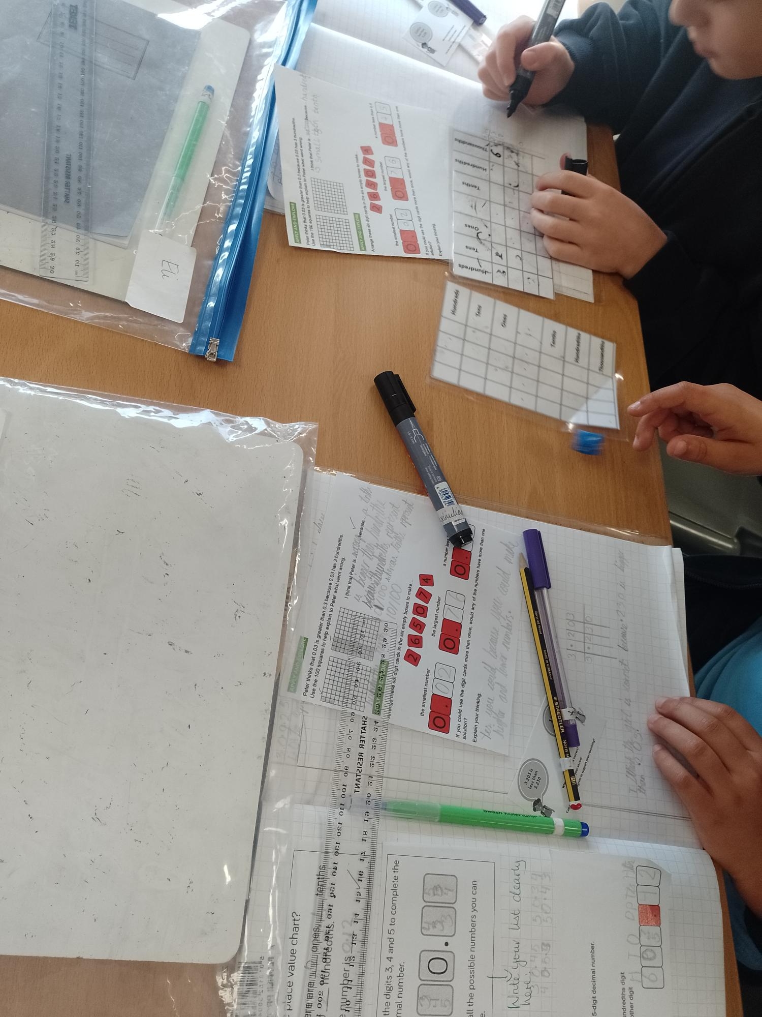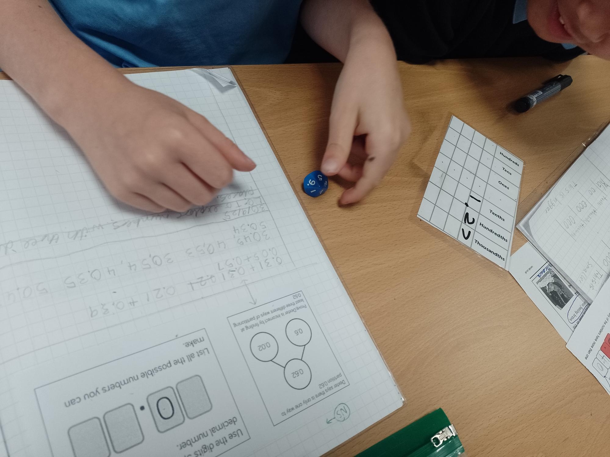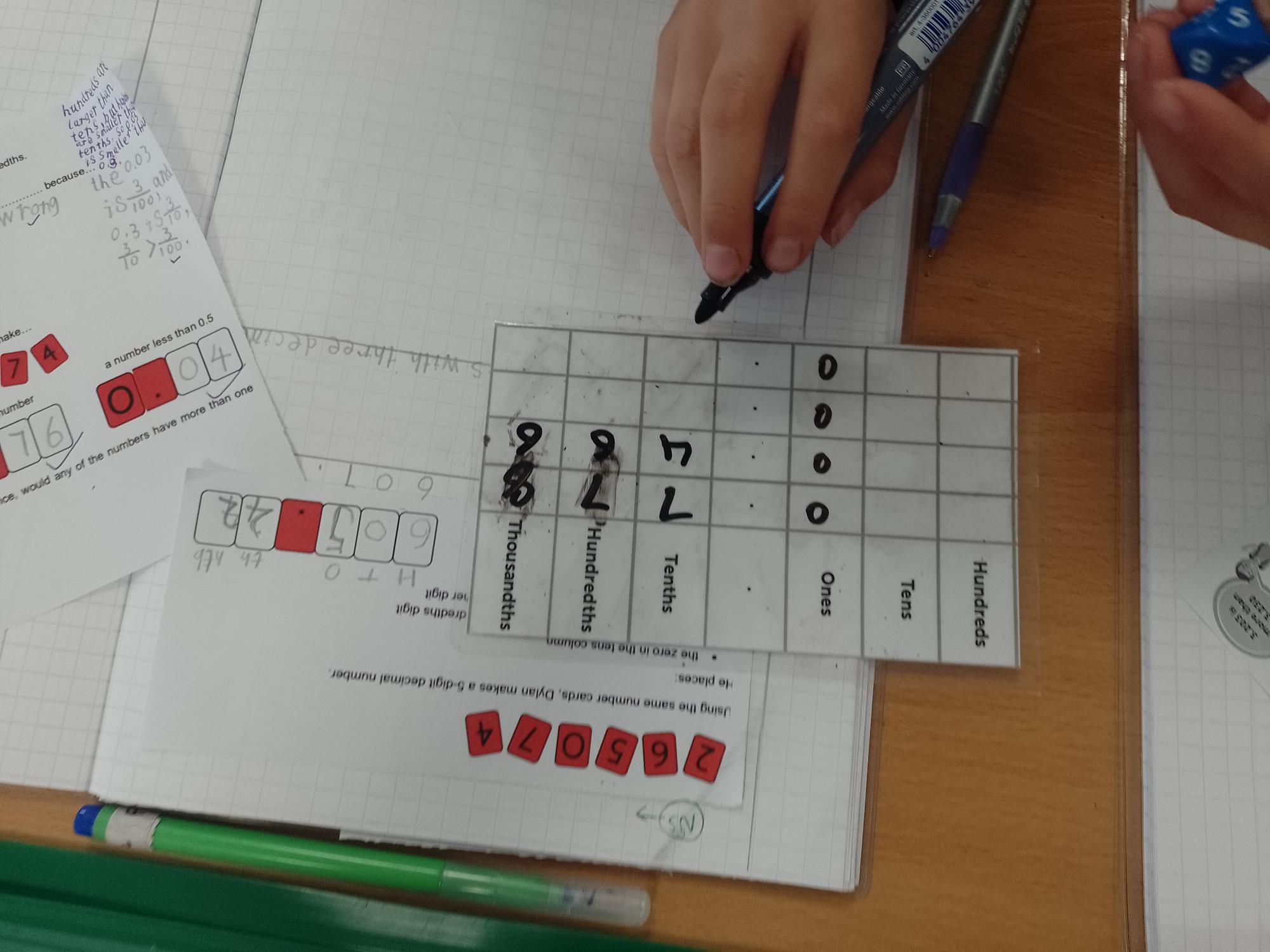 During Maths this week, we have been investigating decimal numbers, looking at 2 & 3 decimal places (so using tenths and hundredths!). We played a game against different partners, using a dice to create the smallest decimal numbers we could!