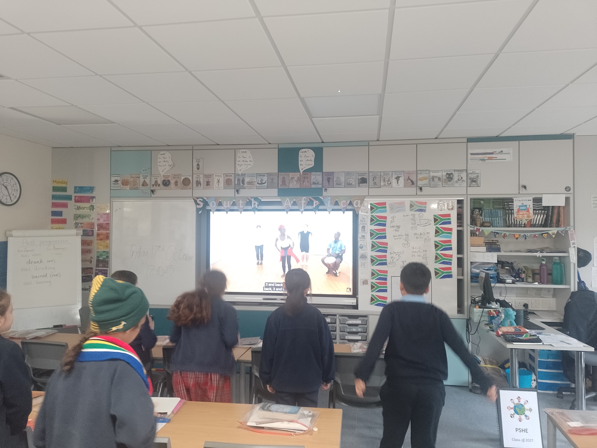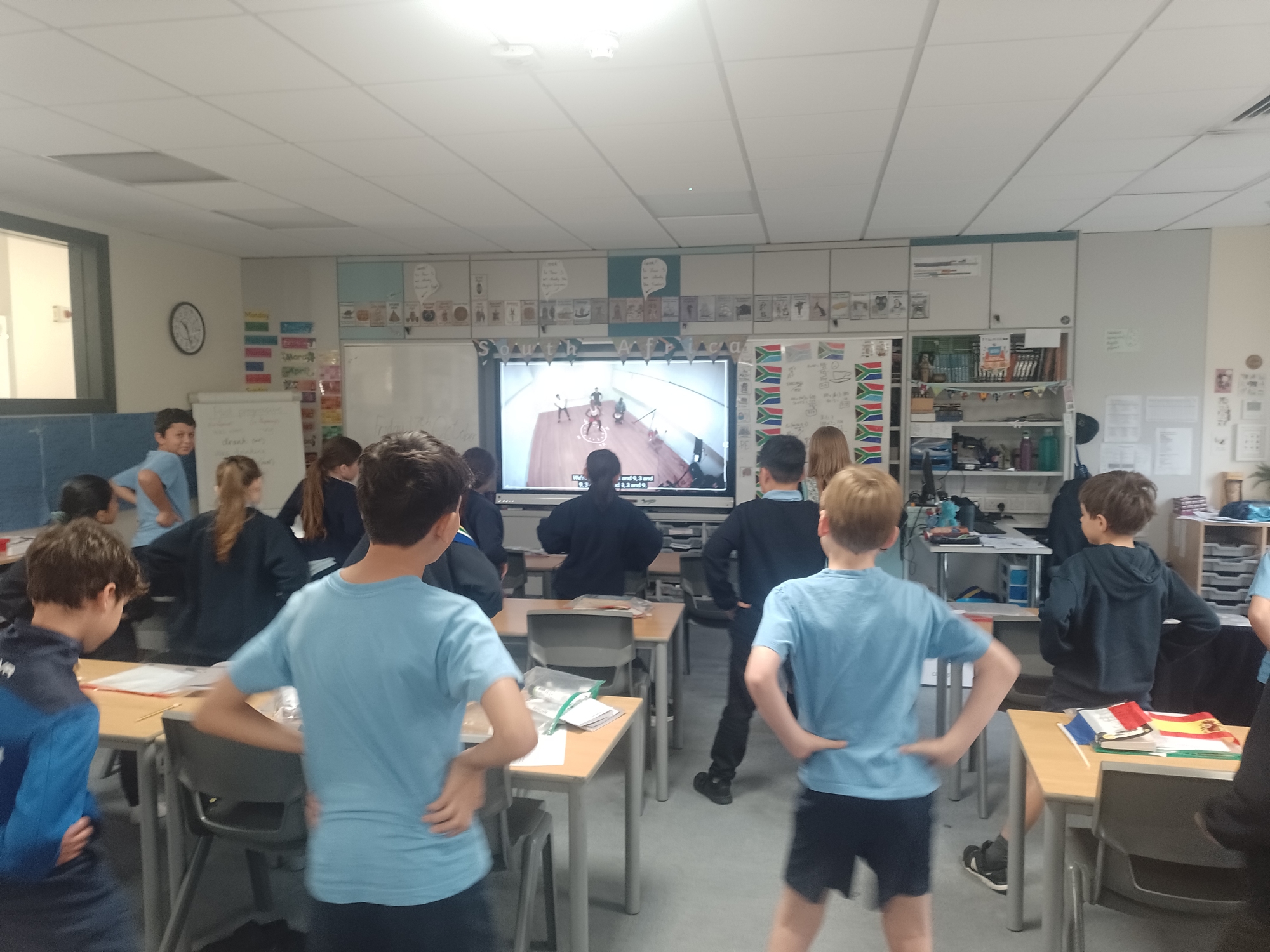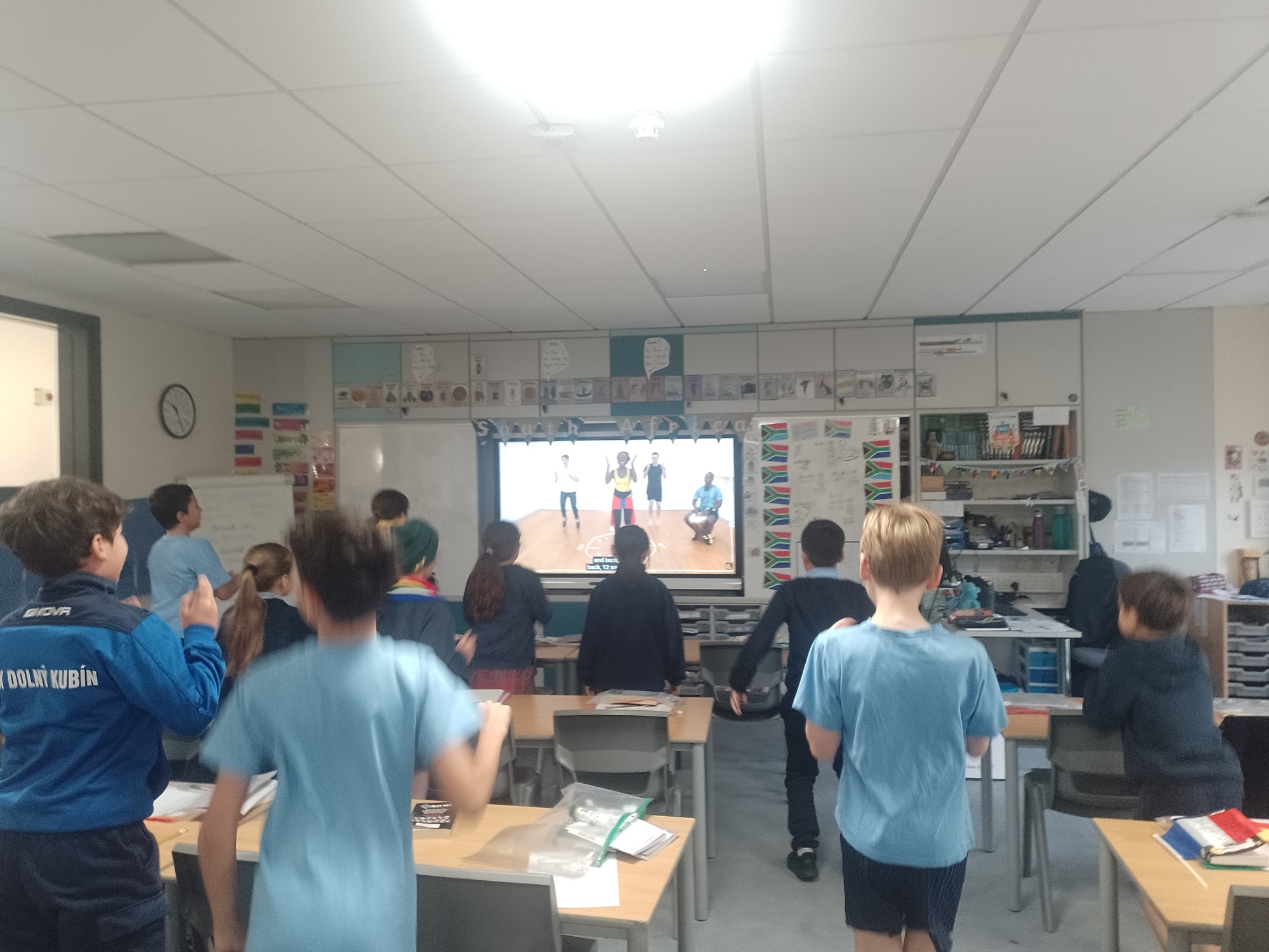 To finish International Week, today we watched traditional South African dancing and practiced some dance moves to imitate. We stepped in rhythm to African drumming and extended ourselves by using a variety of arm movements too.