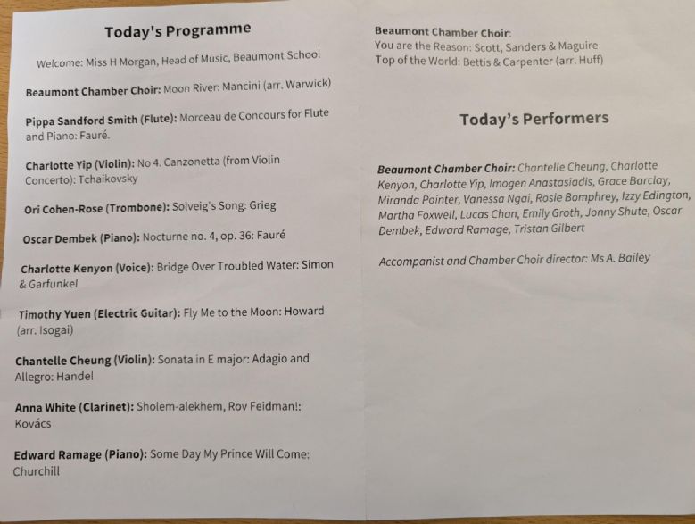 Today, we visited St Peter's Church to watch one of their lunchtime music concerts. We were all impressed by the talented musicians from Beaumont School and the children watched and listened attentively throughout the performance. In fact, the music teacher from Beaumont School and one of the organisers from the church praised the children for their exemplary behaviour.